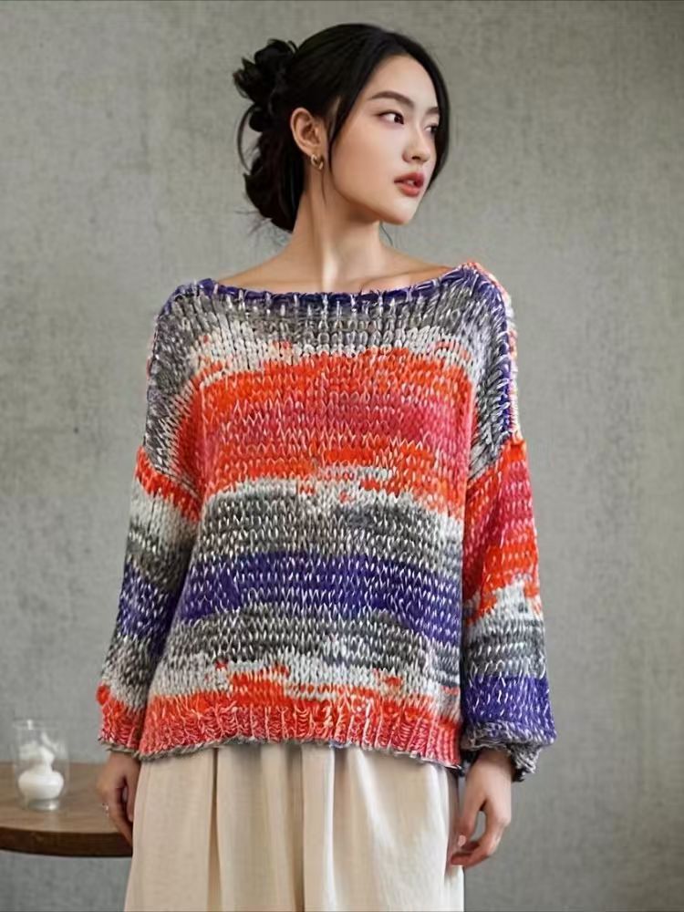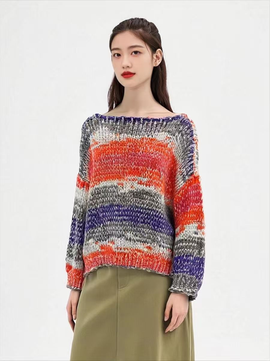 【孤品捡漏】G21粗针一字肩彩条针织毛衫-喜出