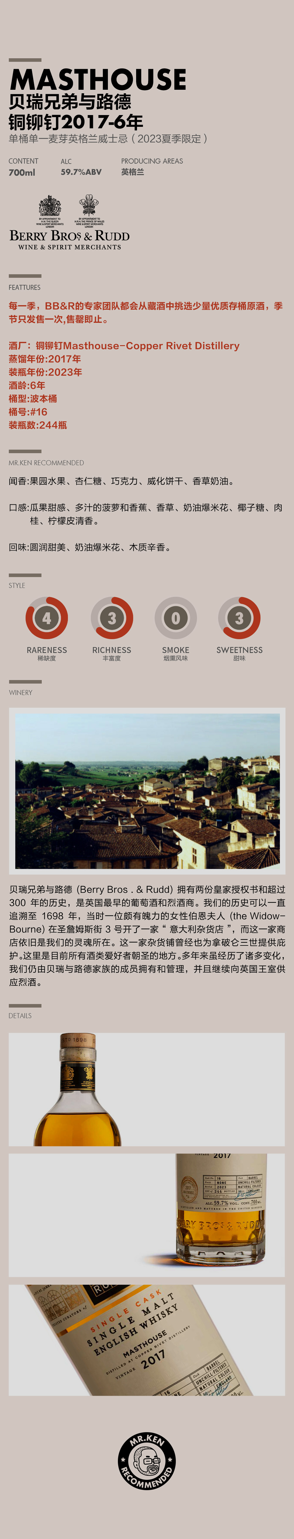 贝瑞兄弟与路德-铜铆钉(Masthouse)2017-6年单桶单一麦芽英格兰威士忌(2023夏季限定)