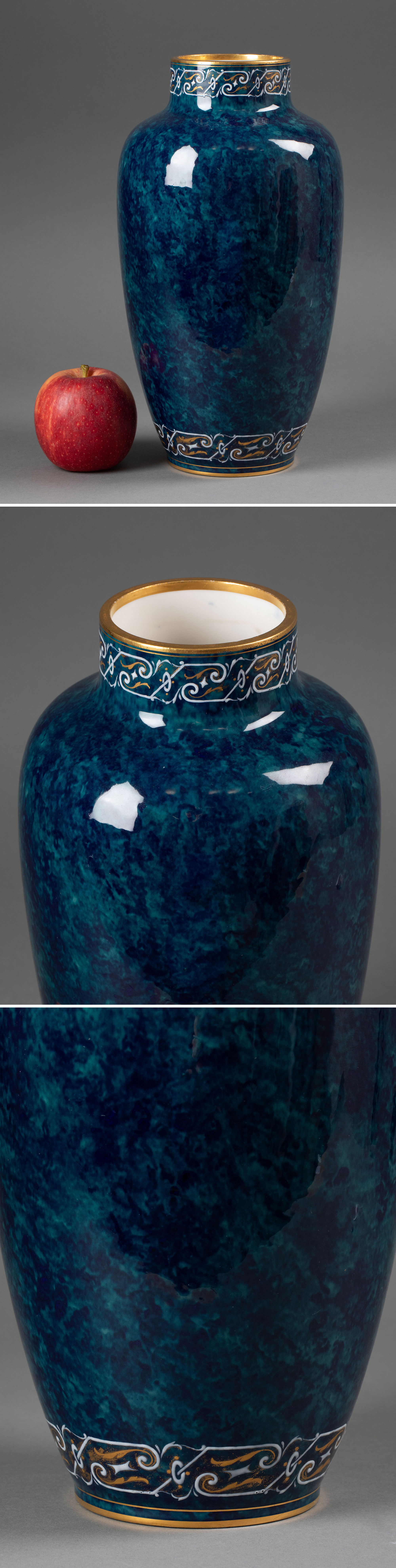 独角鹿西洋古董1884-1885年代法国御窑塞弗尔出品古典卷叶纹手绘描金装饰变彩蓝绿釉花瓶