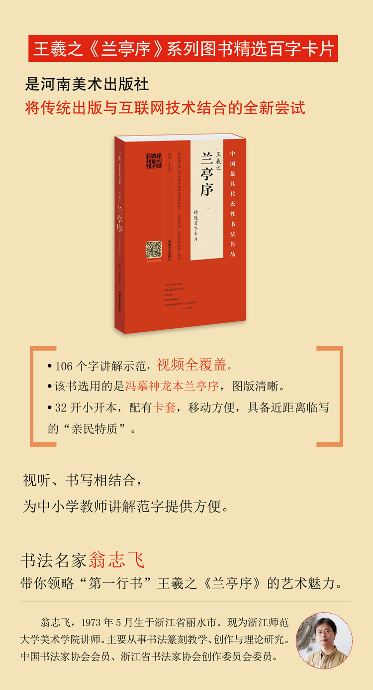 王羲之《兰亭序》精选百字卡片是作者翁志飞精选《兰亭序》中106个范字,进行深入细致讲解。每张卡片正面都印有冯摹本原字和同样大小的翁志飞临摹范字,左下角配有二维码,通过扫二维码可以看到翁志飞老师对此范字精彩的讲解。