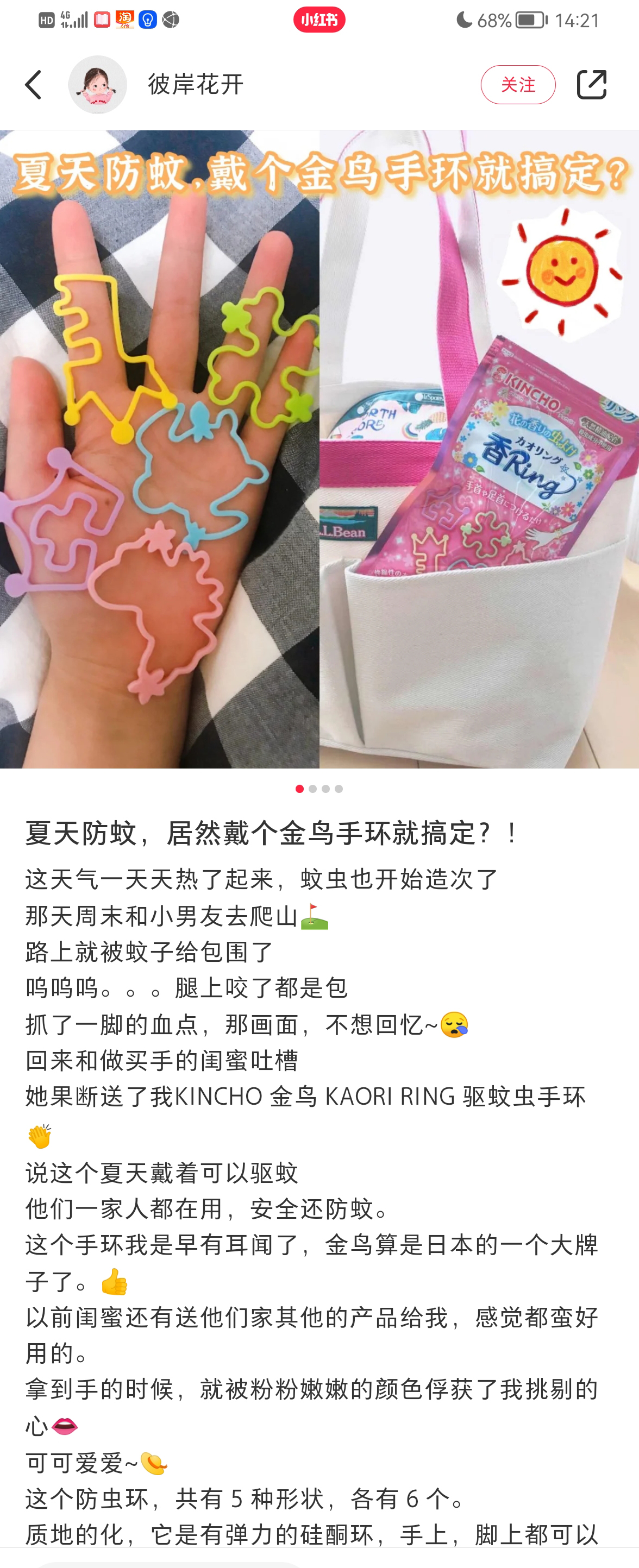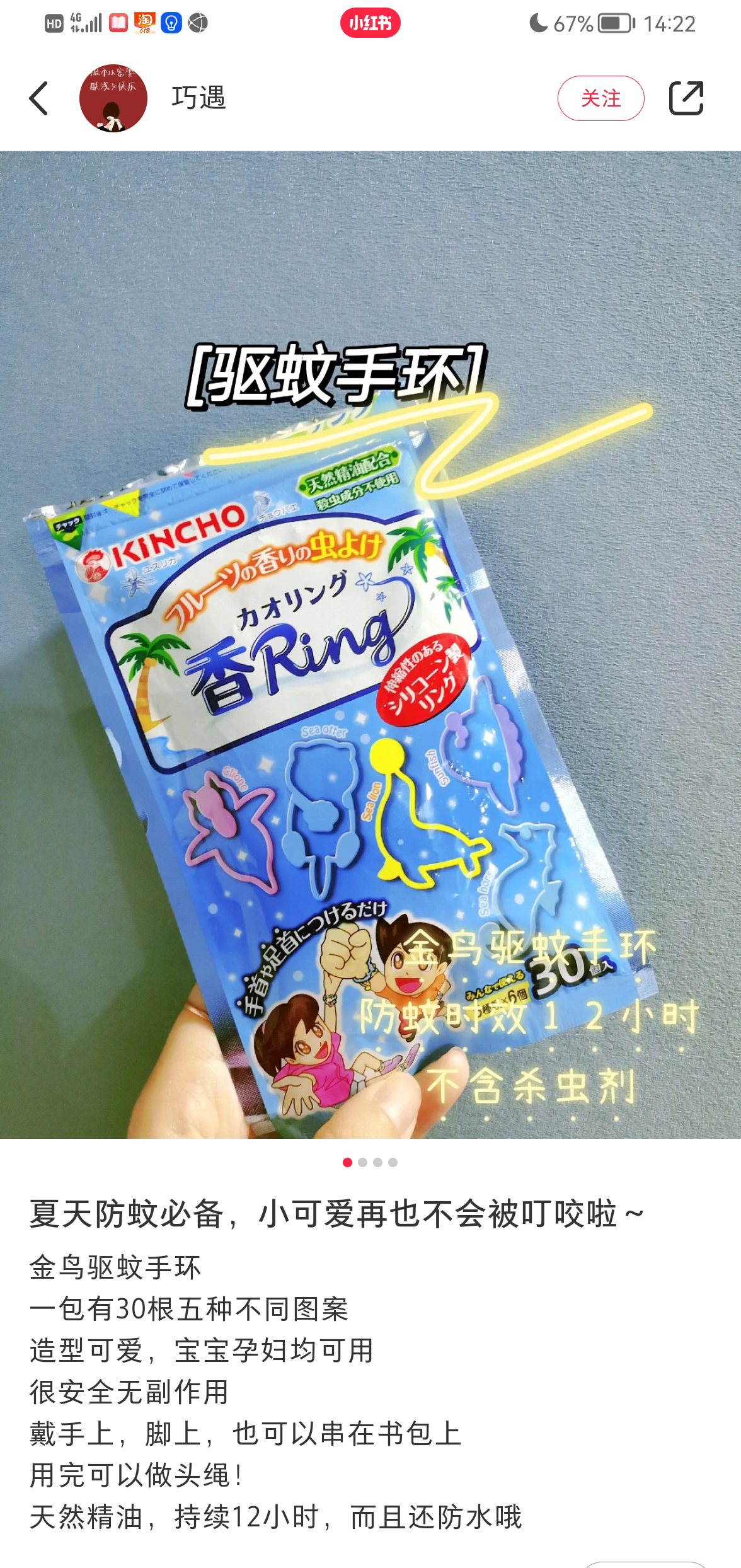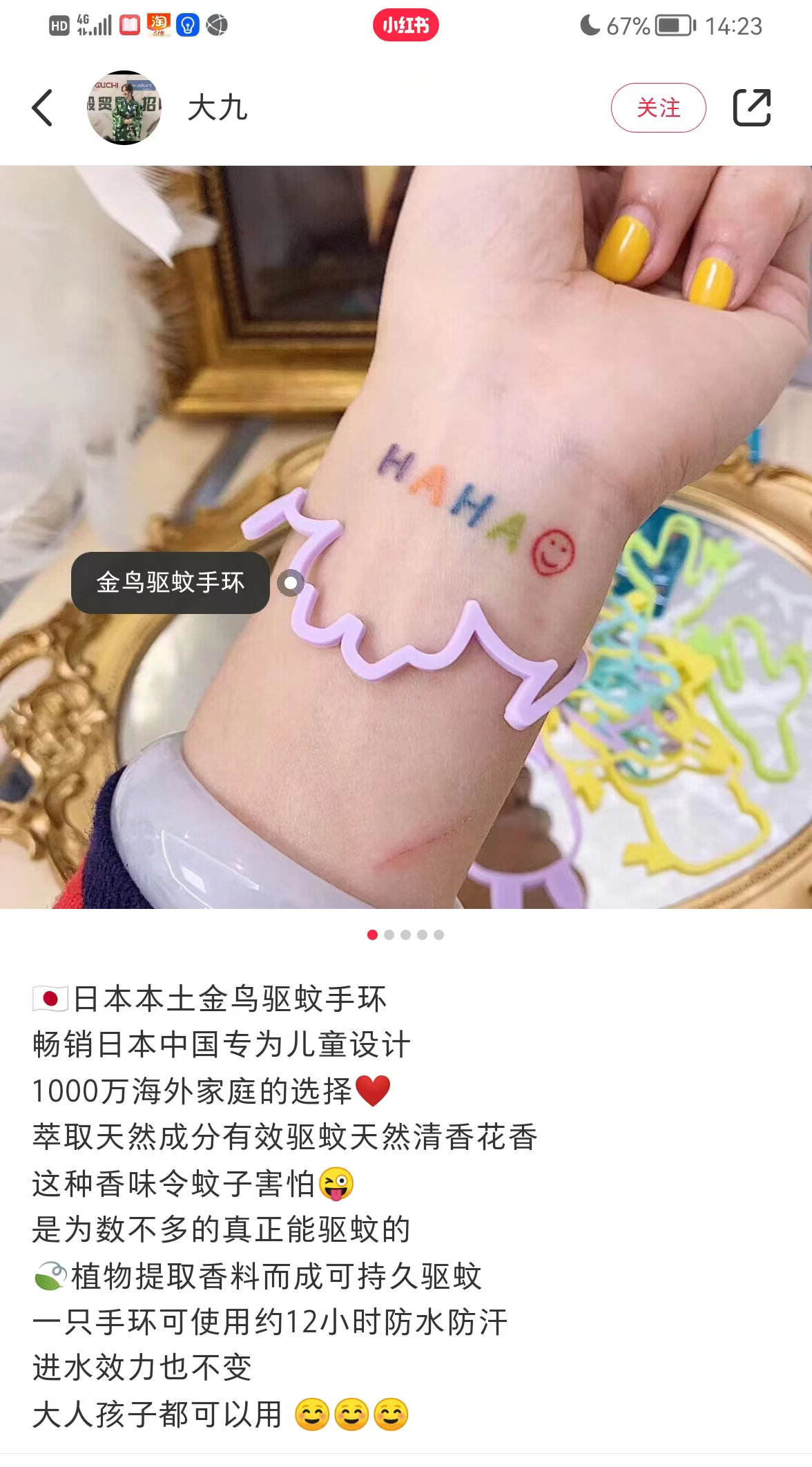 这款手环是日本KINCHO金鸟,是世界上第一家发明蚊香的公司,专注做驱蚊杀虫已经130多年了。研究了下手环的驱蚊原理,传统的驱蚊产品含有的四氟苯酯和避蚊胺DEET是有危害性的,而这个手环主打配方安全,是用一种纳米技术将从植物中提取到的精油,萃取出天然活性粒子,融进食用级生物硅胶里,然后制成固态香胶的手环,慢慢挥发,达到驱蚊的效果。手环是防水的,湿了也不会影响驱蚊效果,游泳也可以戴。