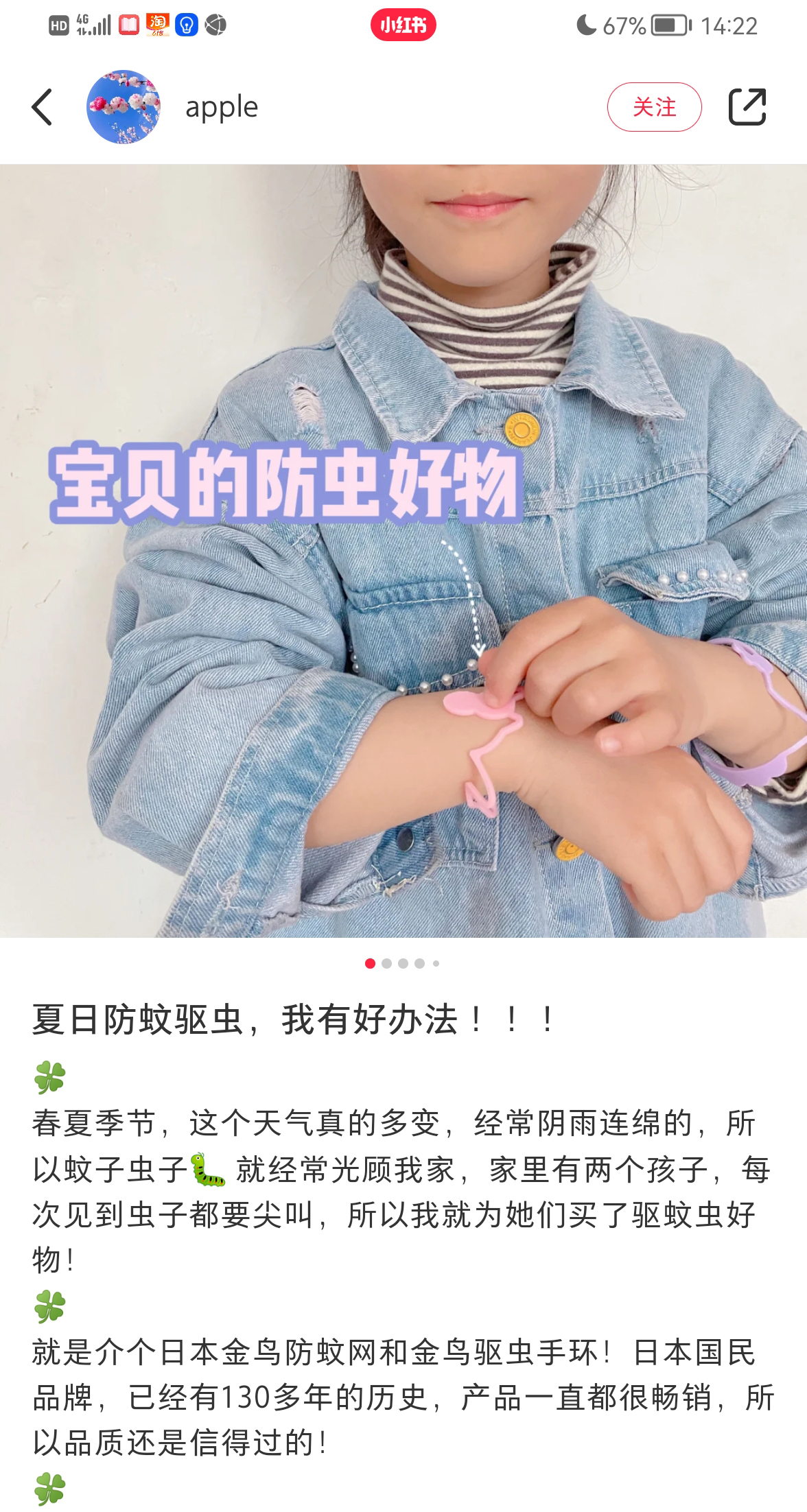 没有杀虫成分,所以是孕婴可用的,但太小的孩子有可能会舔咬,所以建议1岁以上的孩子使用。另外对香味敏感的孕妇也不建议用,因为含有除虫菊精油,手环的味道挺浓的,米妈用下来觉得是能接受的,戴时间久了气味也会变淡,或者可以选择蓝色果香味的,相对好一点。
