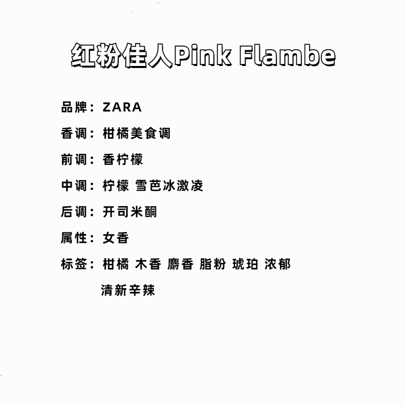 ZARA红粉佳人 90ml香调为花香调,融合了柠檬、茉莉、百合等清新元素,整体呈现甜美果香与淡雅花香交织的淡香水特征。