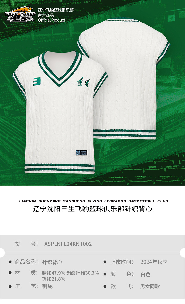 辽宁飞豹男篮 | 球员印号针织背心白绿拼接休闲穿搭继伟杨鸣