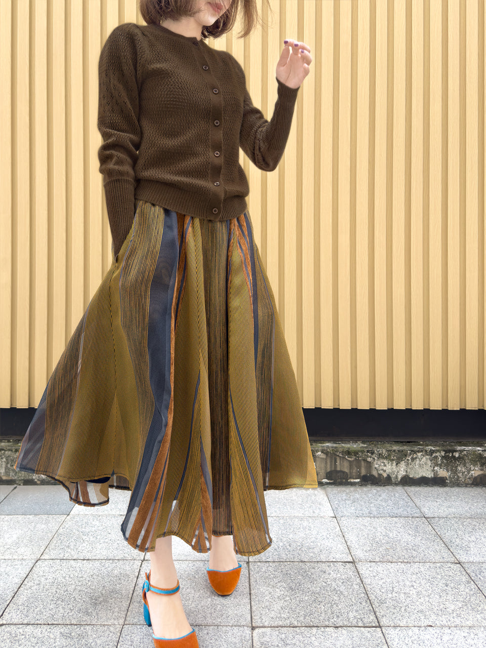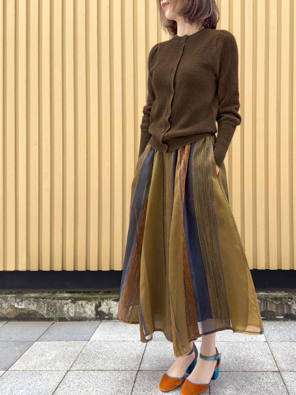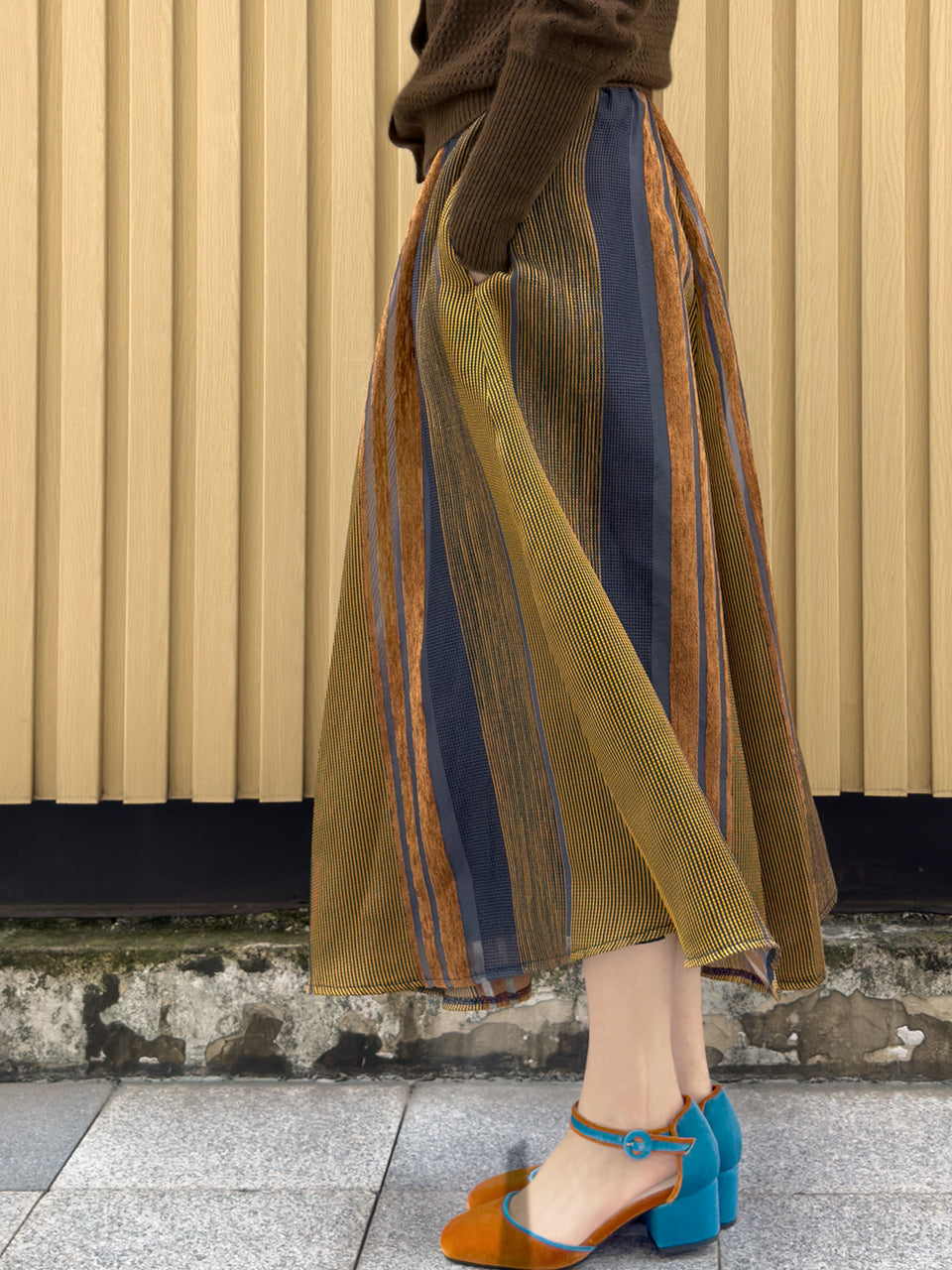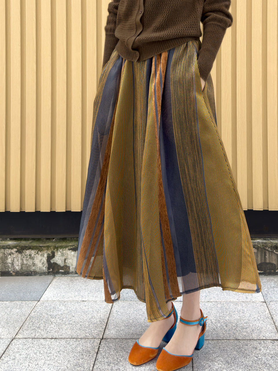 TYNVIE 栗色条纹侧袋欧根纱半身裙