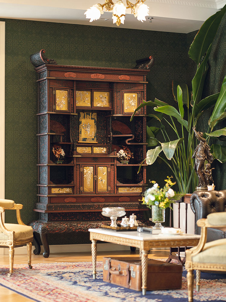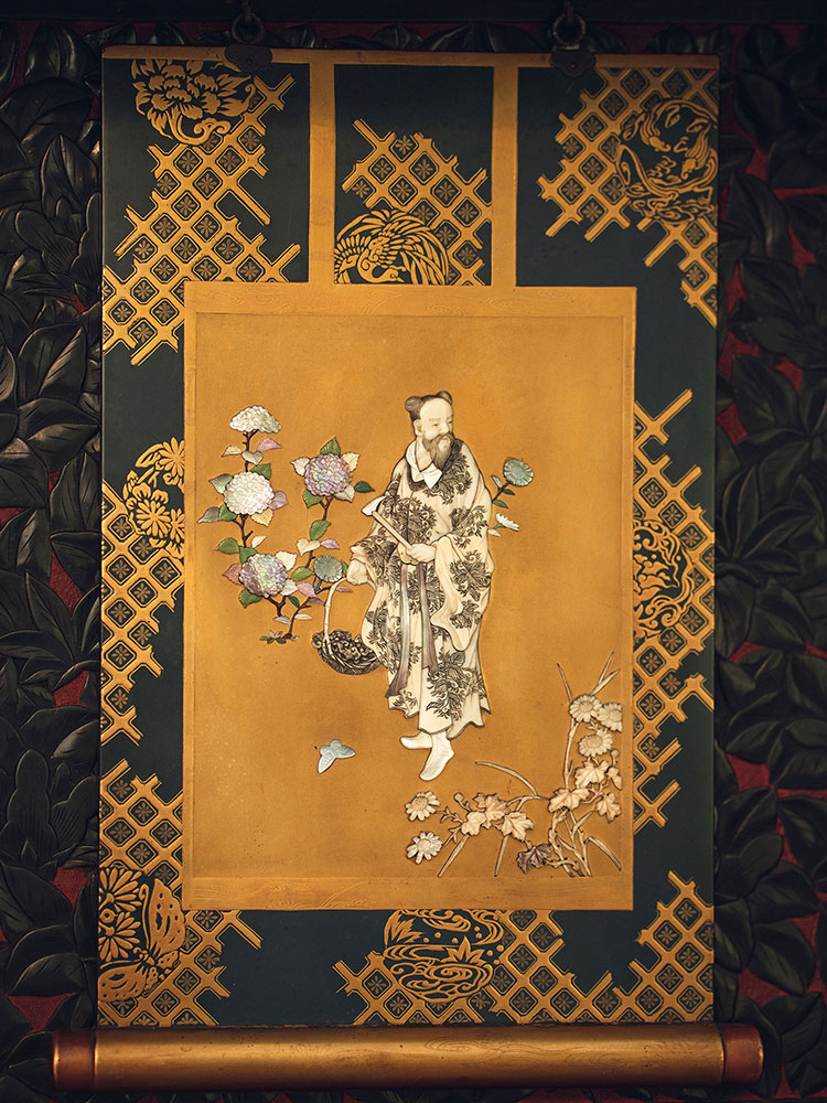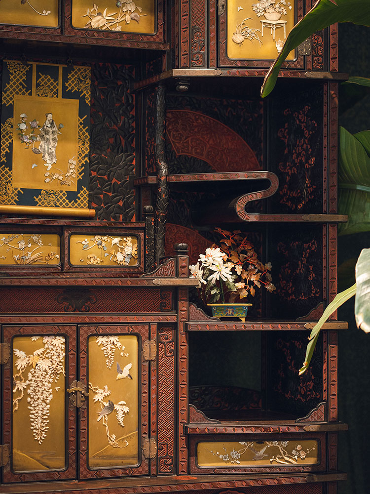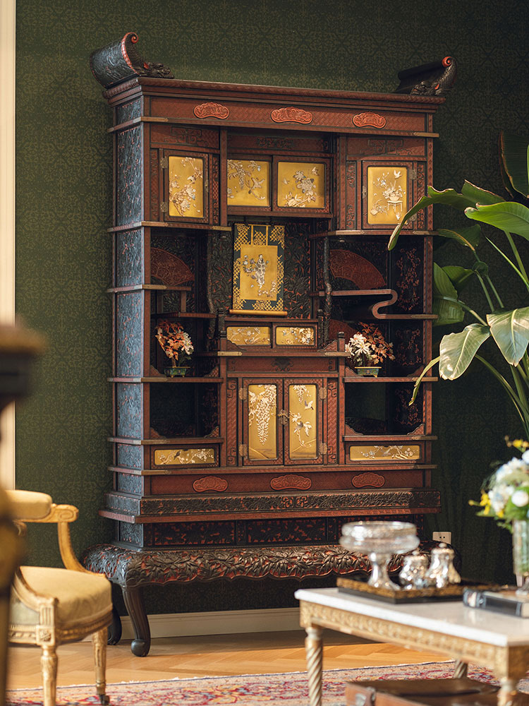 1880年代日本明治时期出品祥纹剔雕传统花鸟人物主题芝山镶嵌大型多宝阁