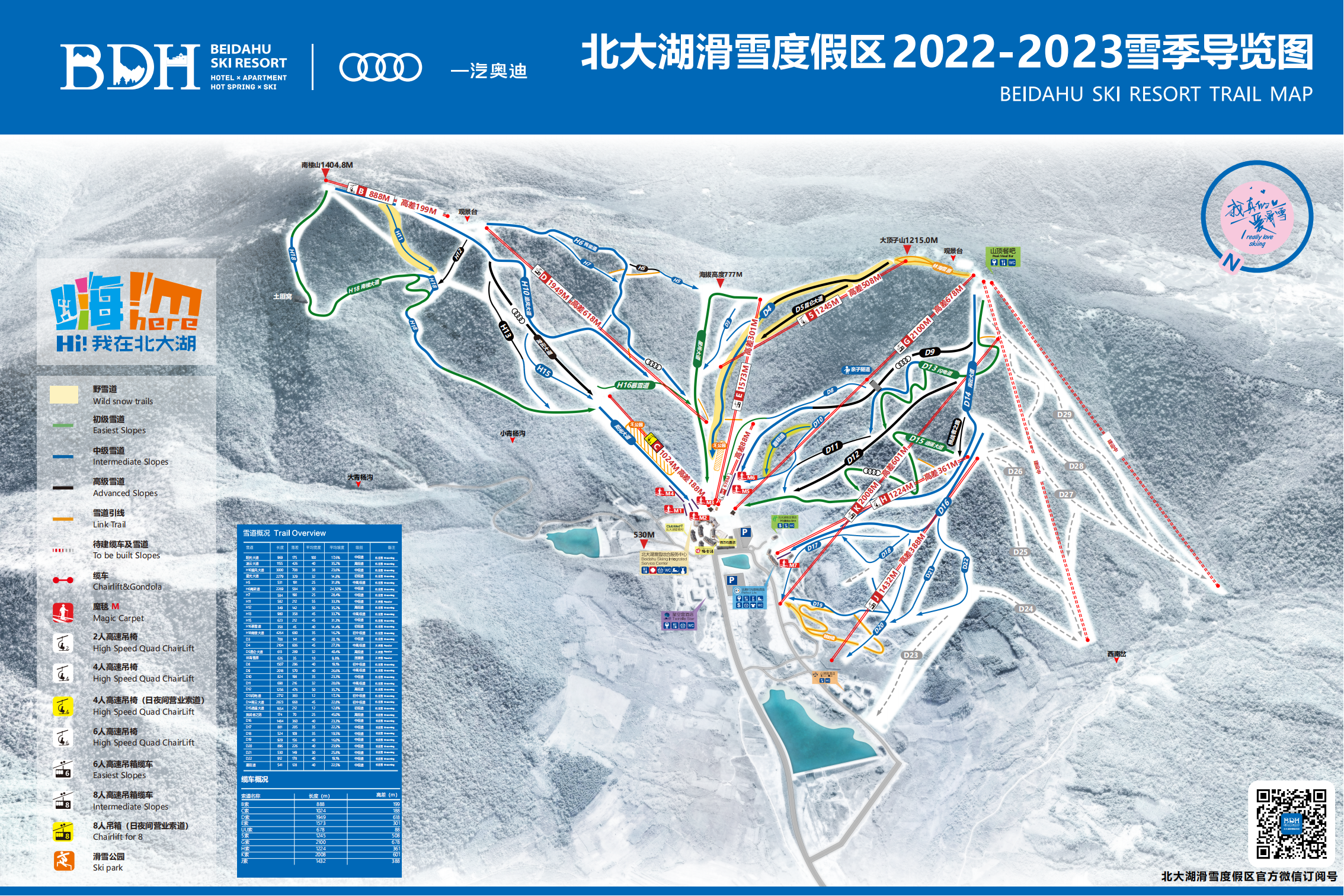 吉林北大湖滑雪场现有雪道总长度约37公里,最大高度差达930米,是目前国内雪道山体落差最大的滑雪场。