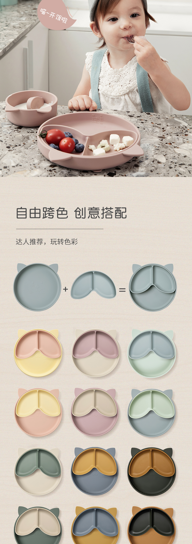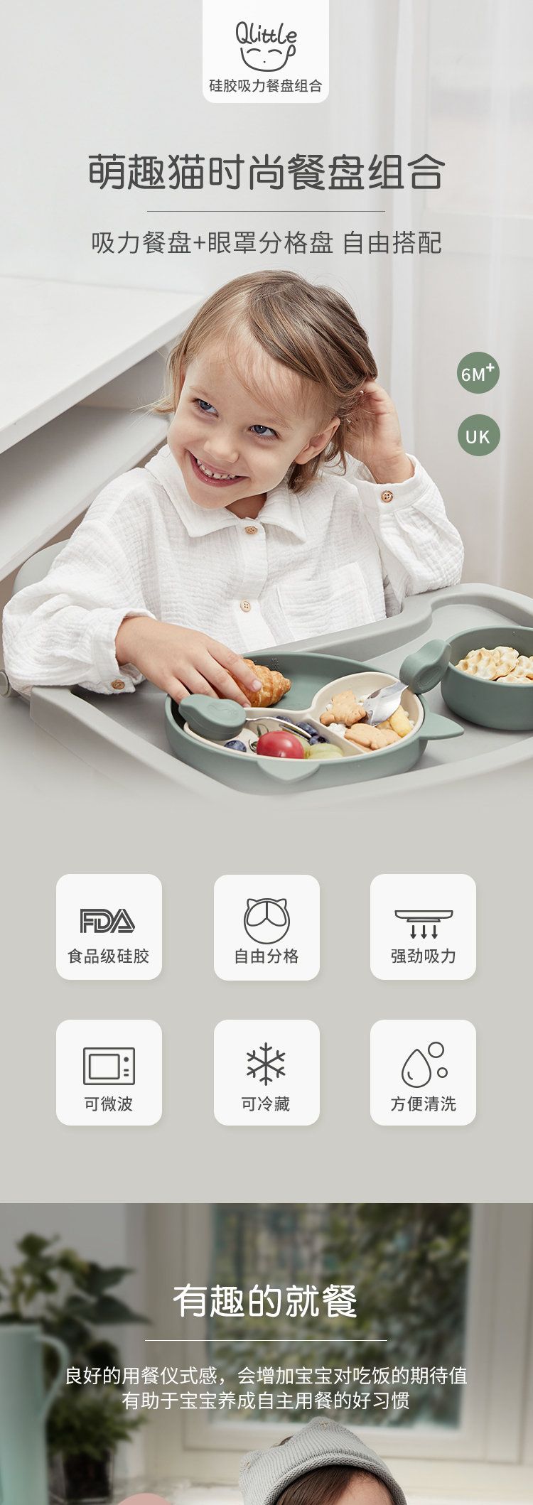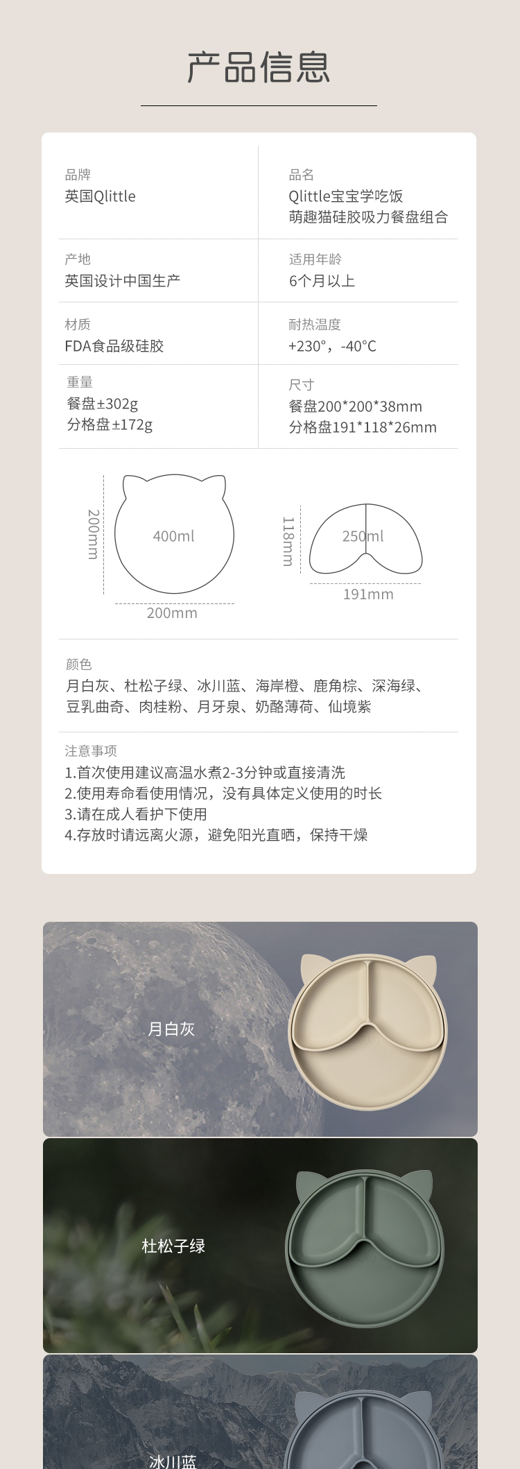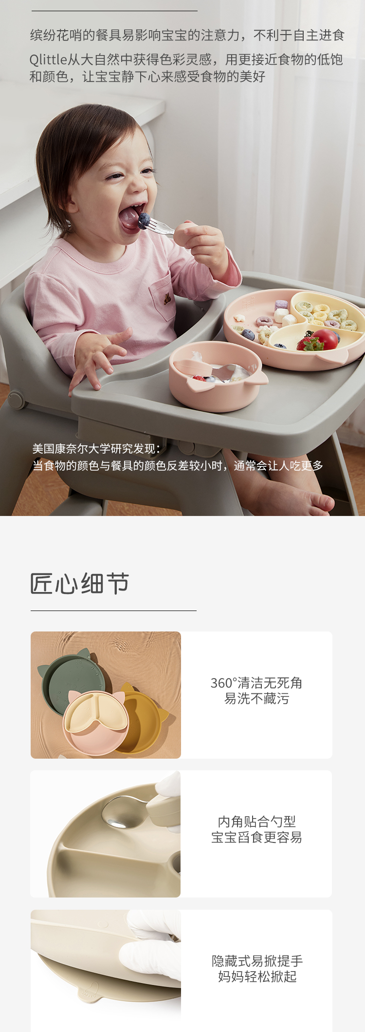Qlittle儿童餐盘宝宝辅食防摔防烫吸盘式食品级硅胶分格餐盘套装