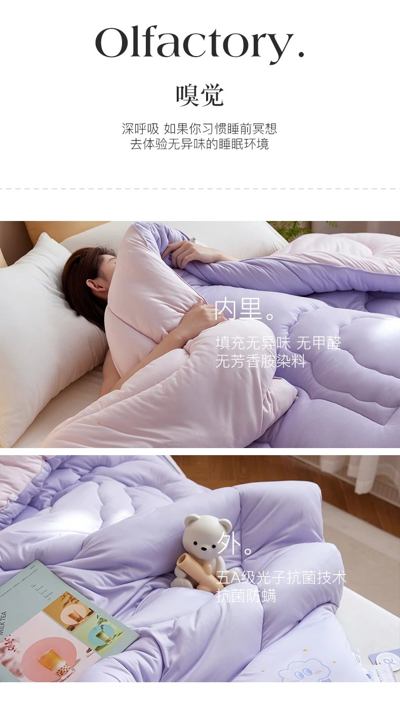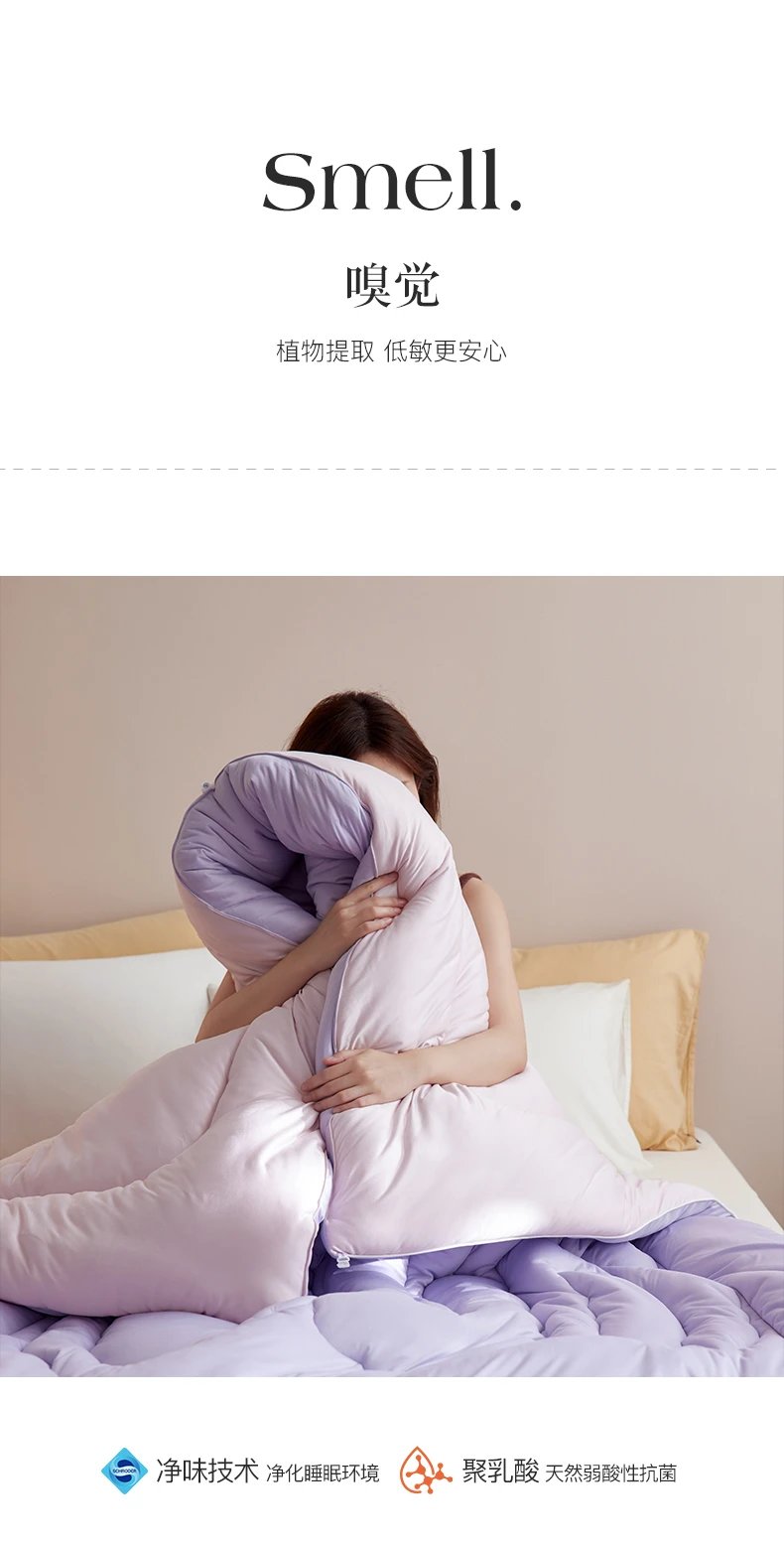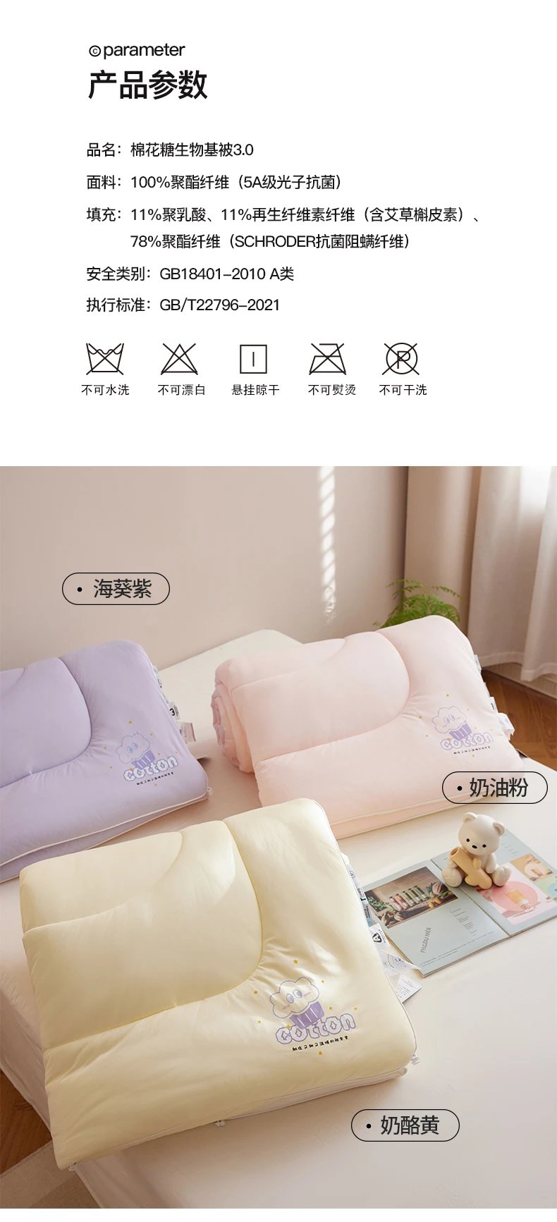 填充:11%聚乳酸、11%再生纤维素纤维(含艾草槲皮素)、78%聚酯纤维(含抗菌防螨)