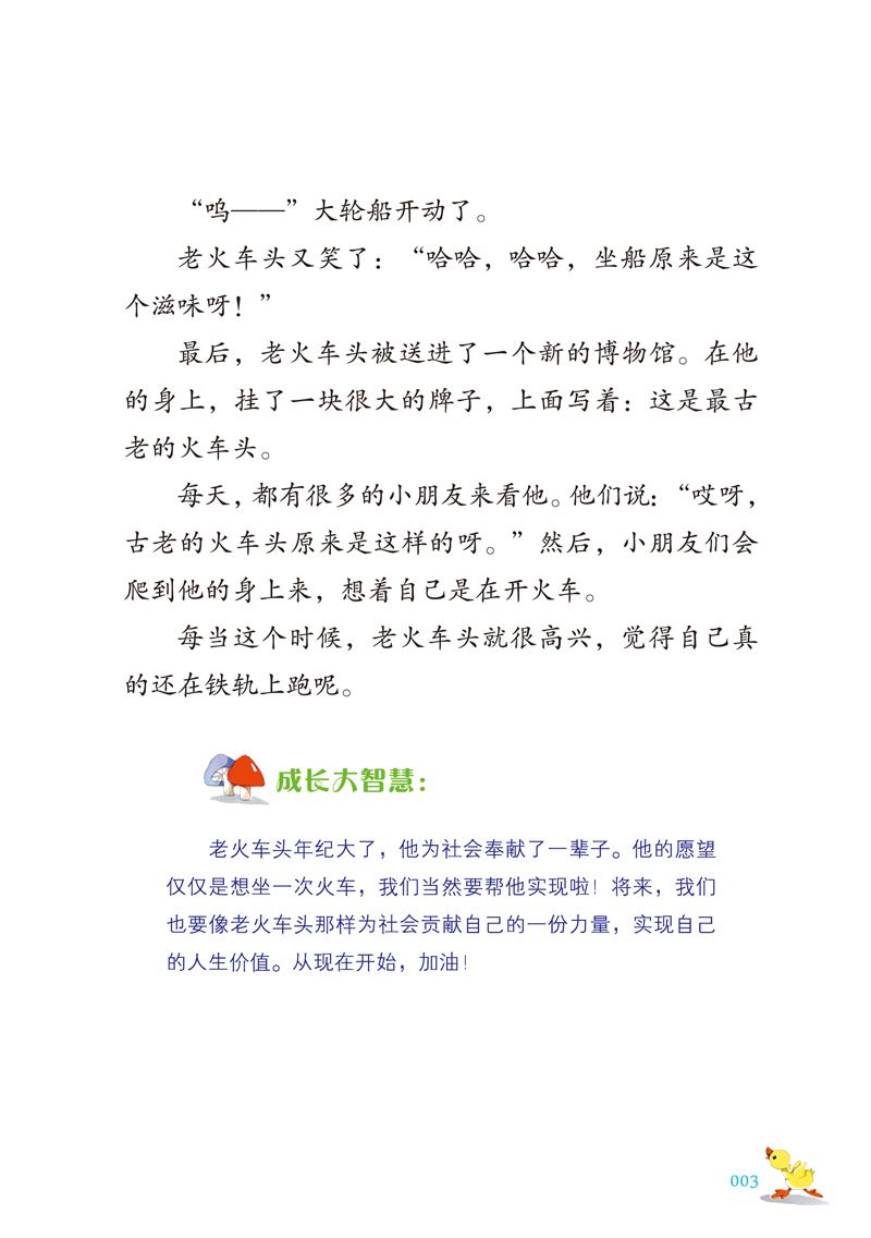 管理员一听,就呆住了。是啊,老火车头让人家坐了那么多年的车,自己却从来没有坐过车呀。这个愿望可一定得满足。