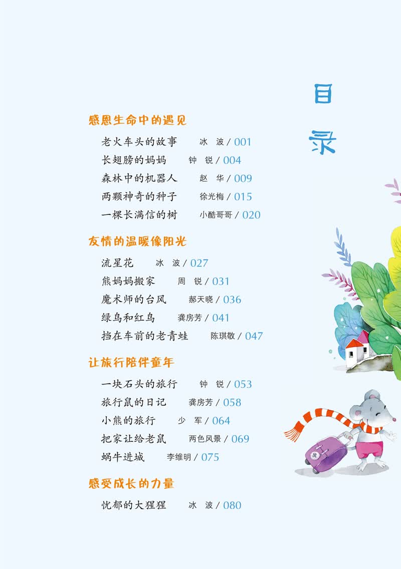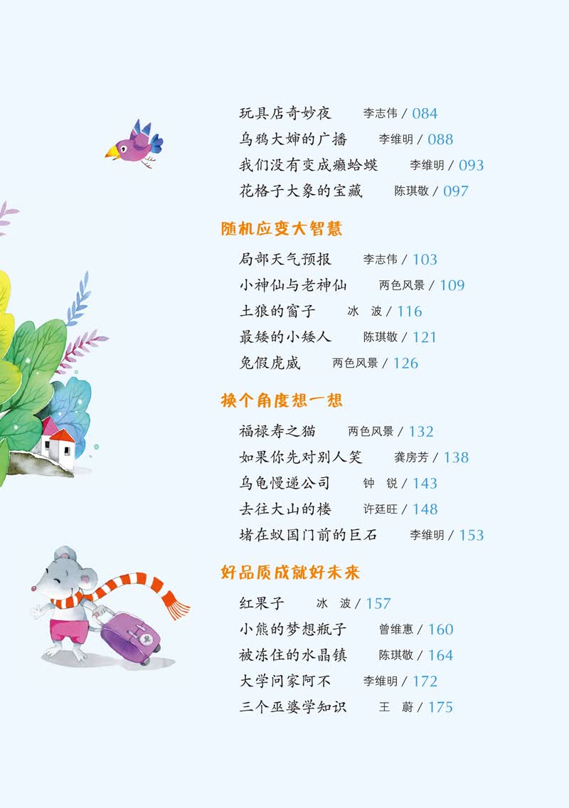 本套书精选例如周锐、冰波、李志伟、贾为、龚房芳、两色风景等当前24位著名儿童文学作家的175篇作品,做成童话集。每本图书按照每本不同的七个主题进行分类,如“遇事不自私 大家齐分享”“感恩生命的遇见”“感受成长的力量”等。每个类别五篇童话,每篇童话后附成长大智慧,让孩子在享受阅读的同时,心灵得到滋养。正文插图为精致的手绘插图,每本书插图40余张,带给孩子以美的视觉享受。
