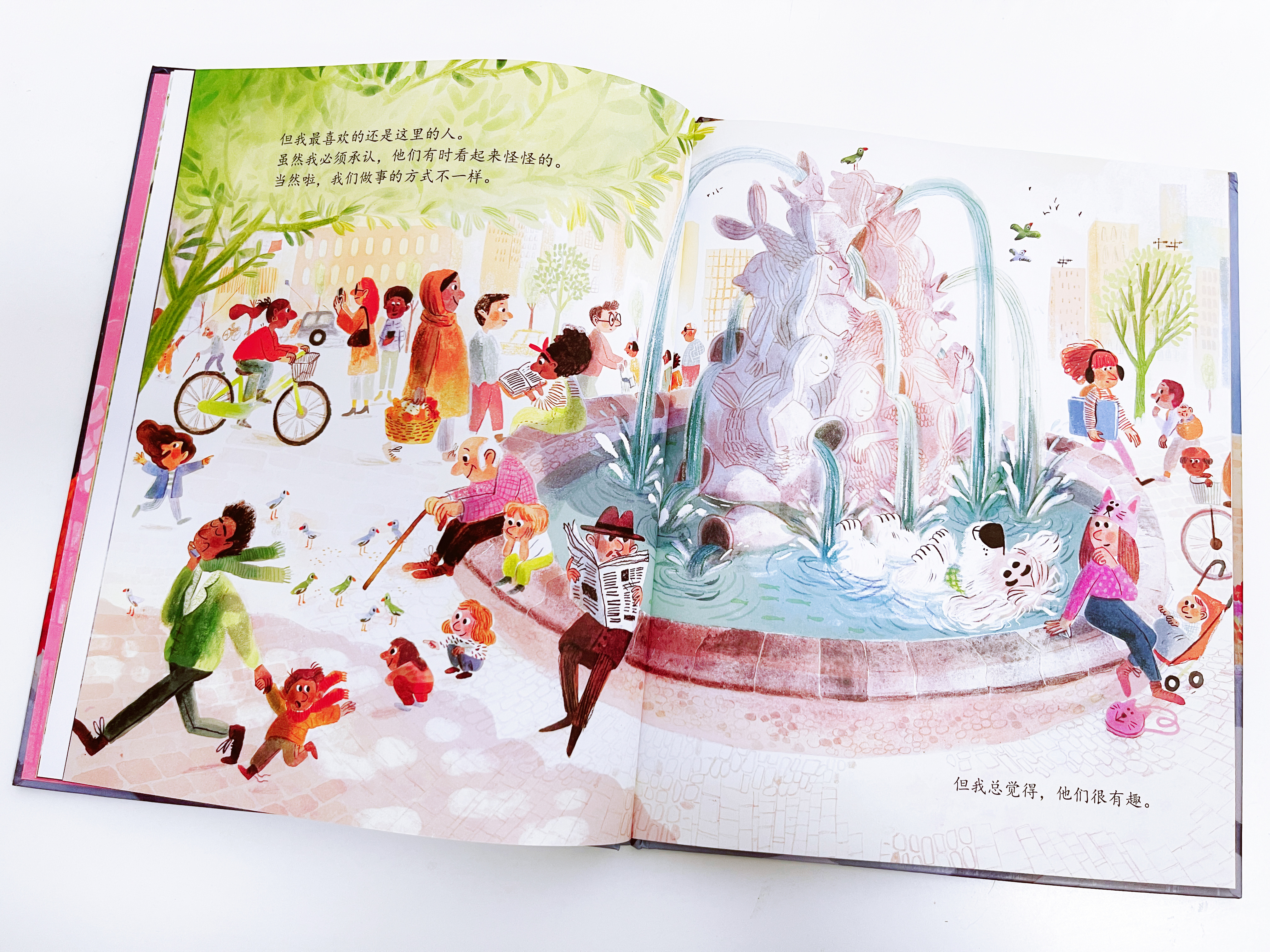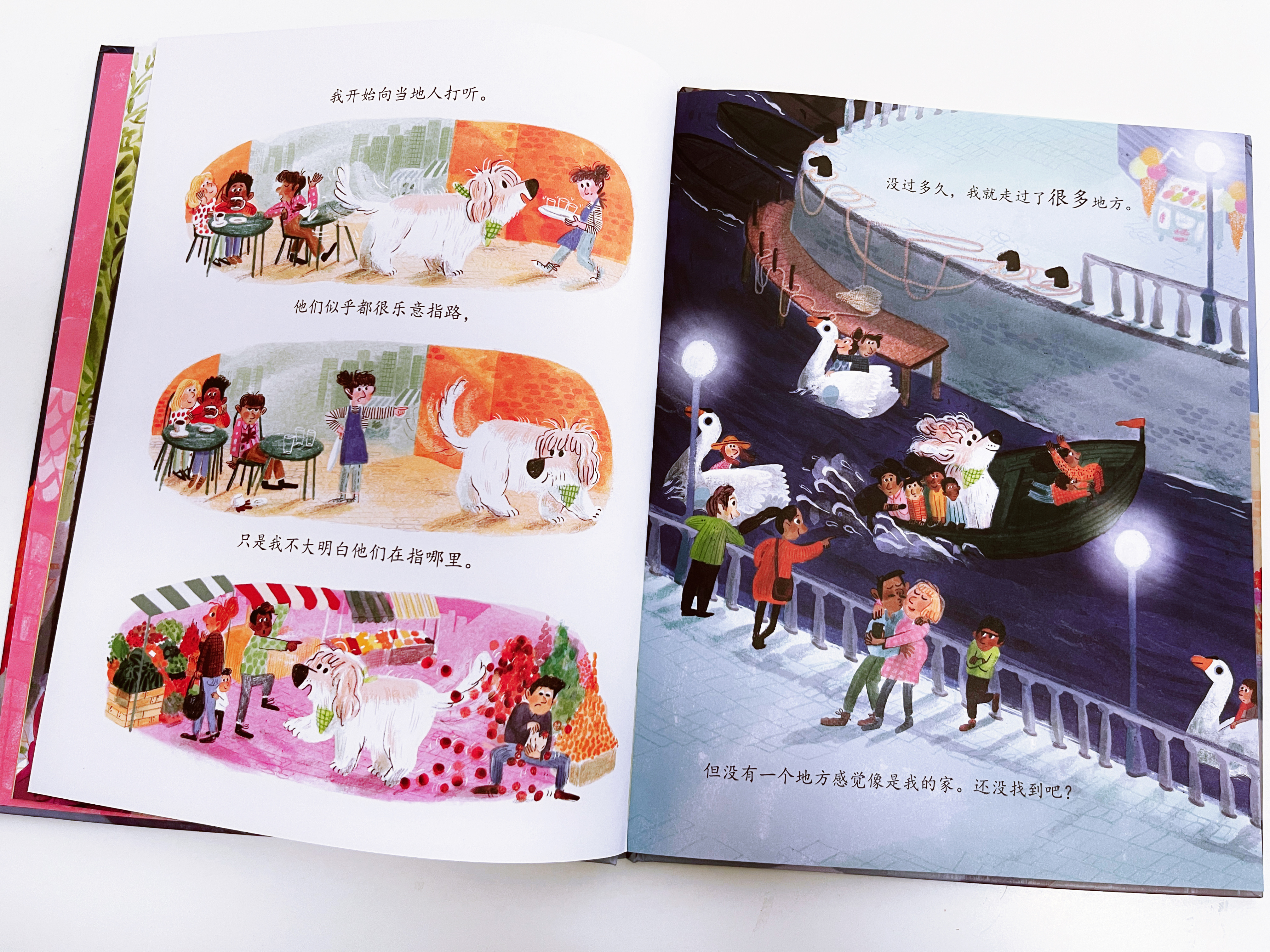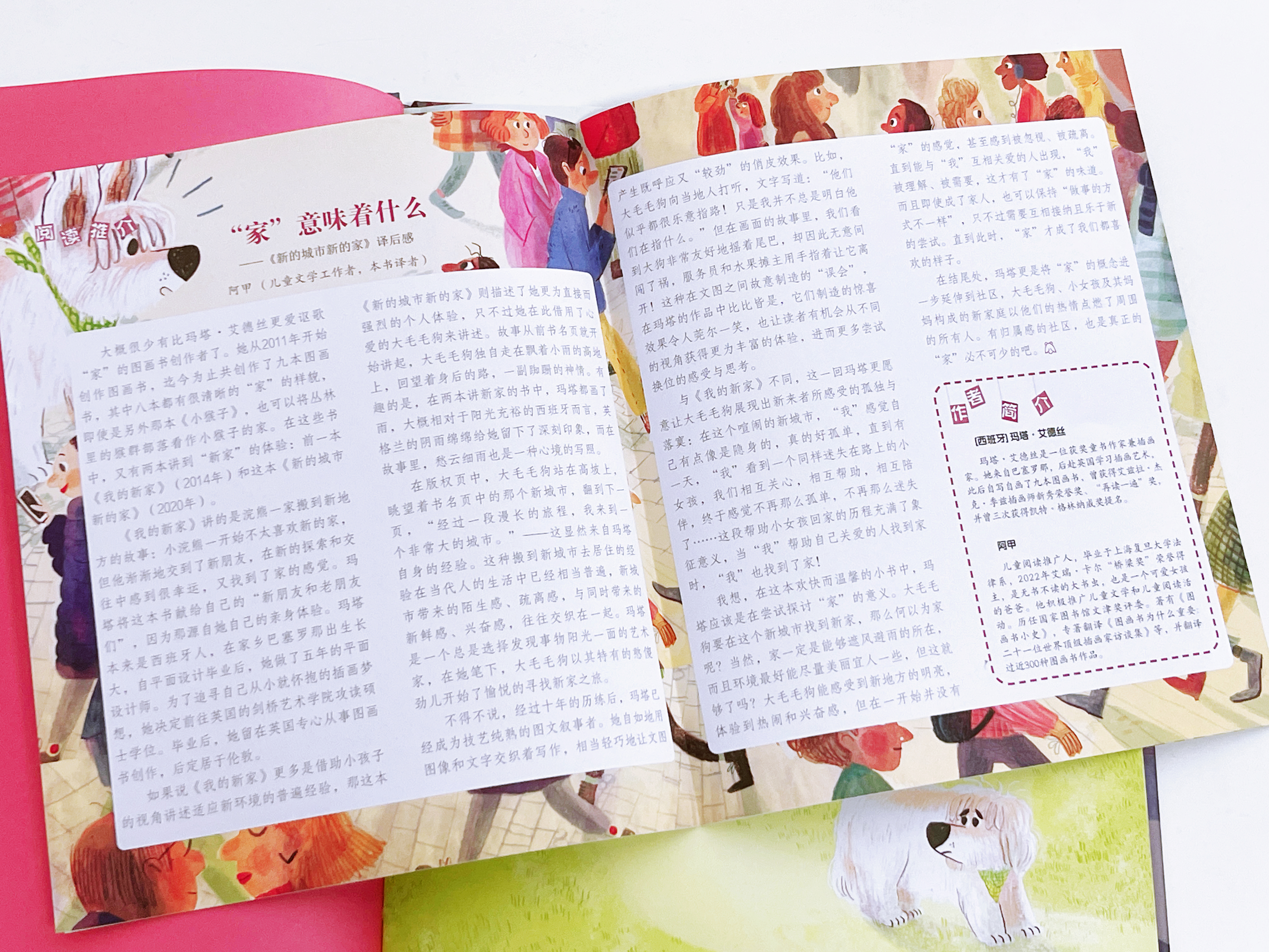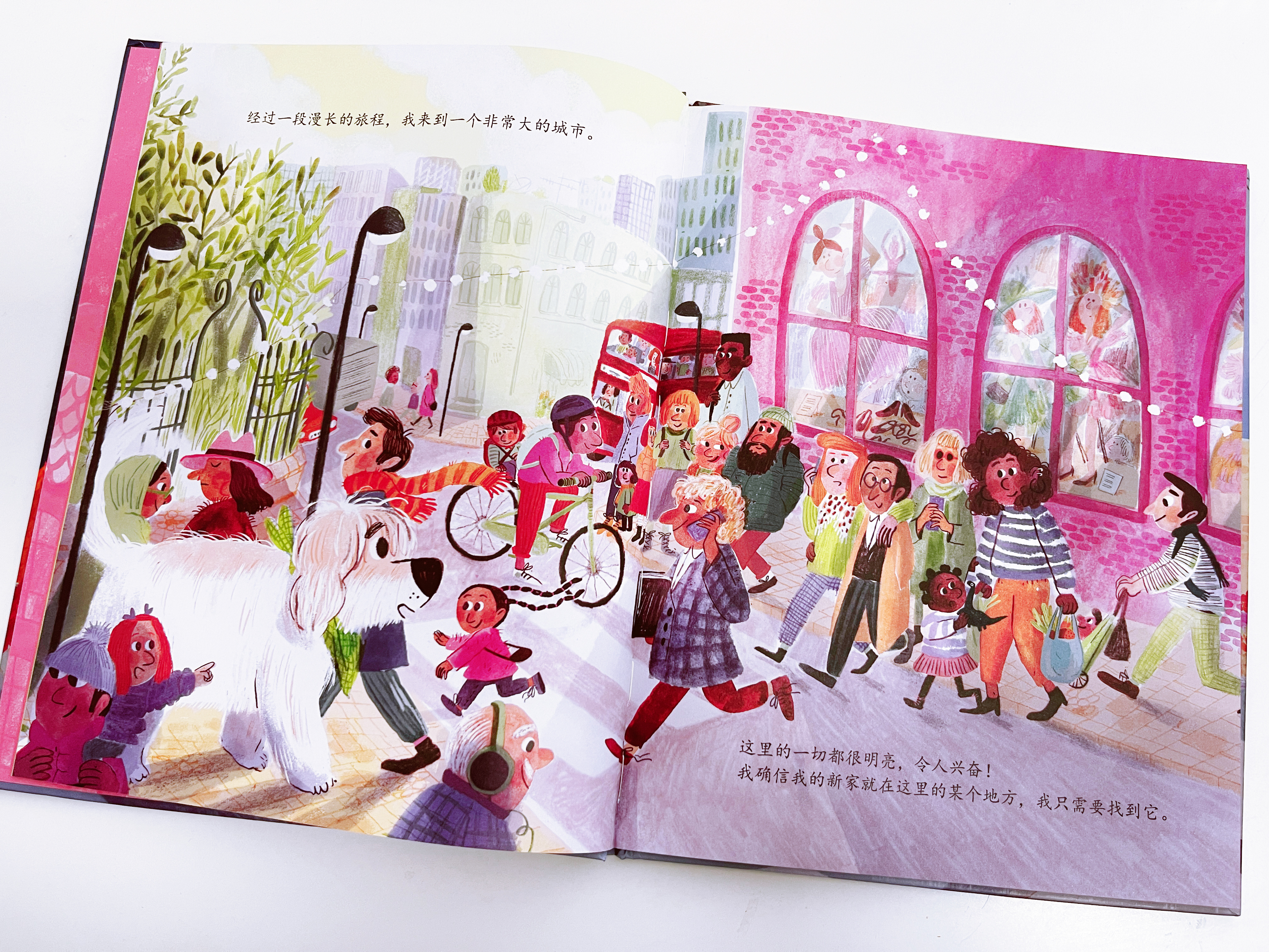 《新的城市新的家》讲的是一条大毛毛狗来到一座新城市寻找新家,大毛毛狗向当地人打听,文字里写道:“他们似乎都很乐意指路,只是我不大明白他们在指哪里。”但在画面里,我们看到大狗非常友好地摇着尾巴,却在无意间闯了祸,服务员和水果摊主都用手指着让狗离开!—文图之间故意制造的“误会”,产生了既呼应又较劲的俏皮效果,由此制造的惊喜效果令人莞尔一笑,也让读者有机会从不同的视角获得更为丰富的体验,进而更多尝试换位的感受与思考。在这本书中,读者在微笑之余,或许也能体会新来者所感受的孤独与落寞。