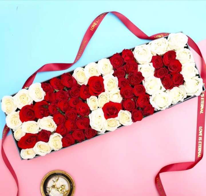 花材:22支白玫瑰,46支红玫瑰,60cm礼盒