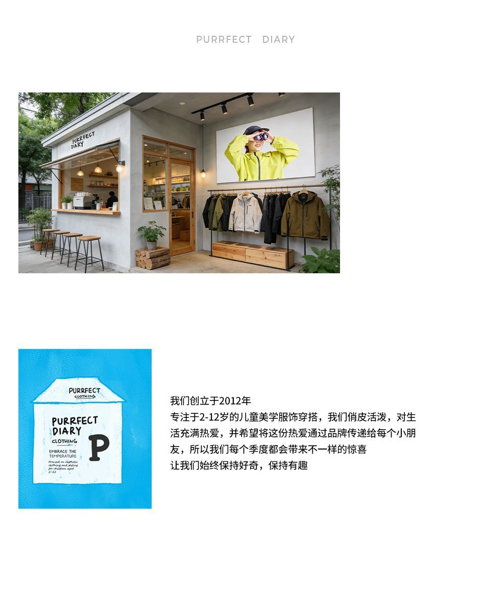 - Purrfect-Diary专注于贴近自然随性的穿着概念,轻奢平价的童装文化传播,在产品设计上更加注重婴童穿着的舒适性、安全性、更出众的国际化品牌,将欧美的育婴文化在中国进行深入的传播与推广。