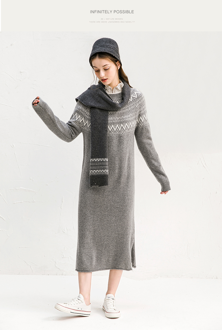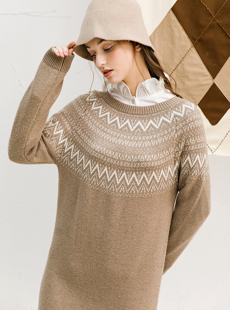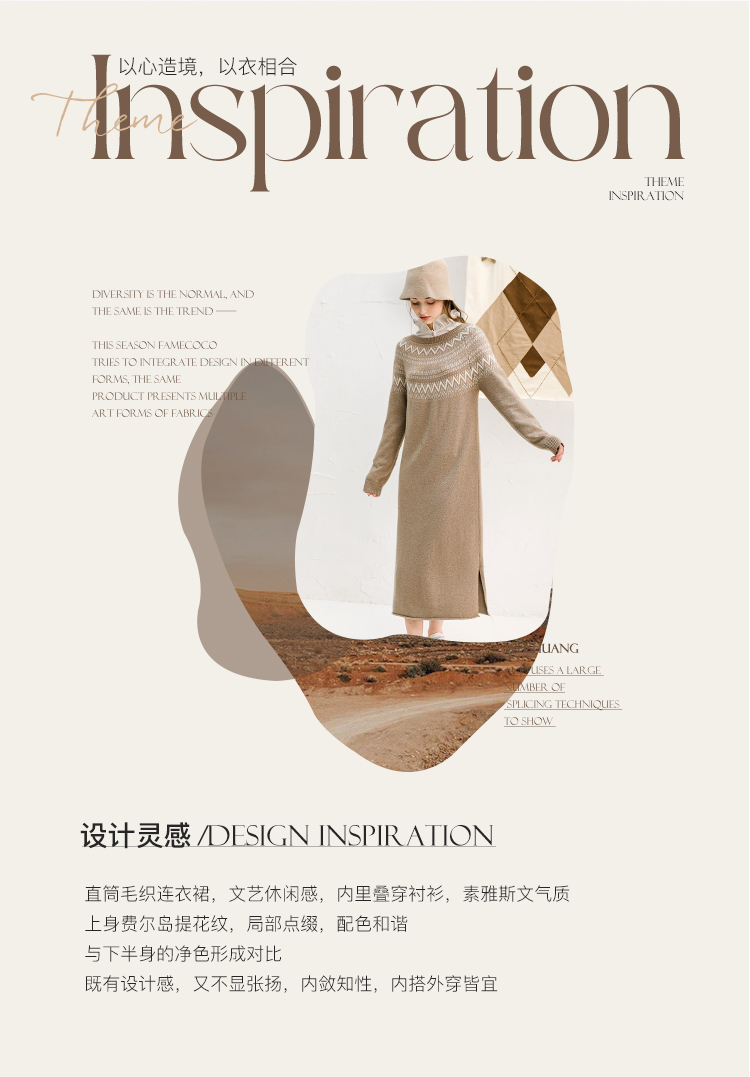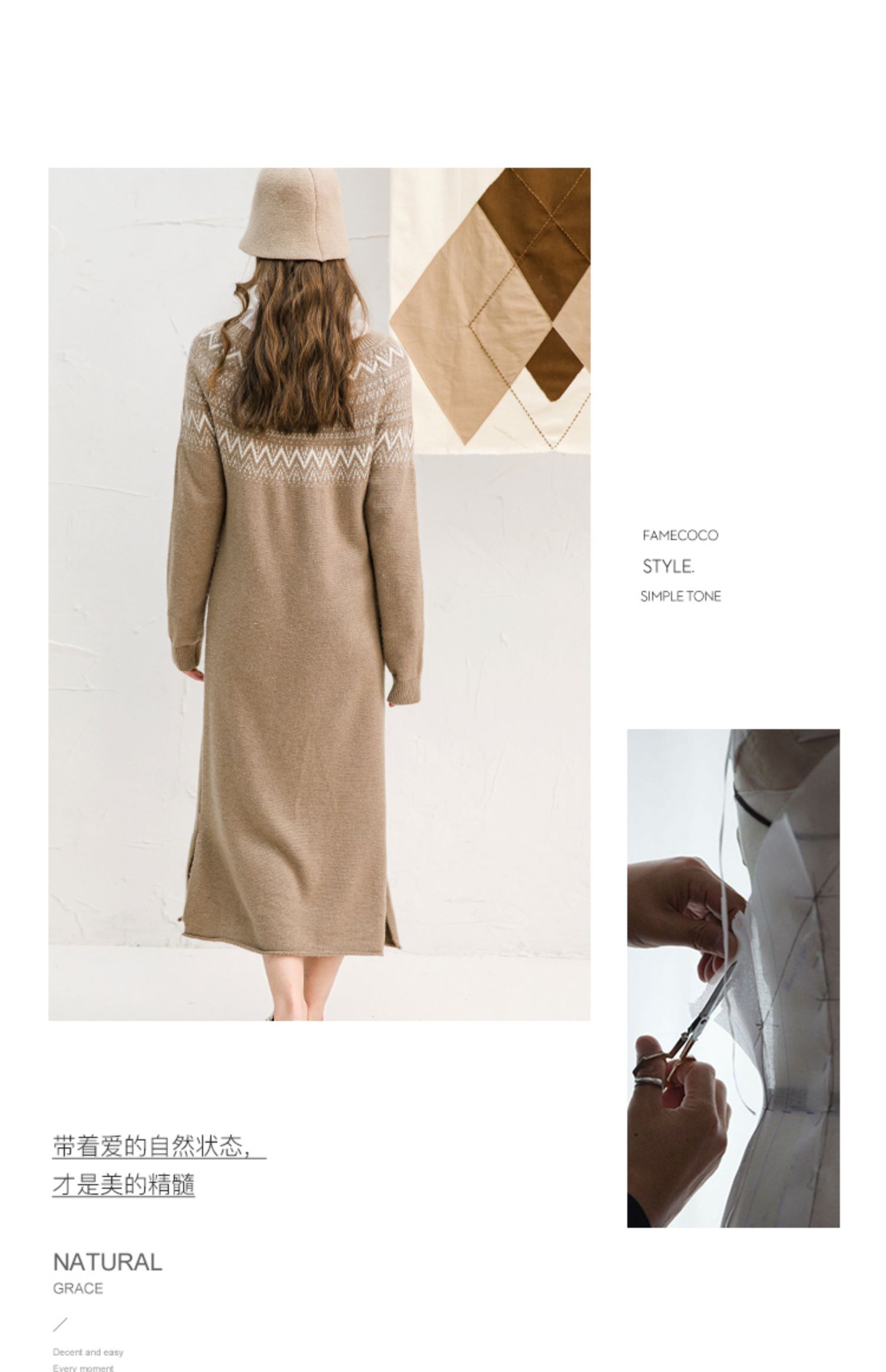 Famecoco范可儿长袖连衣裙秋冬复古提花针织长裙F218FA010