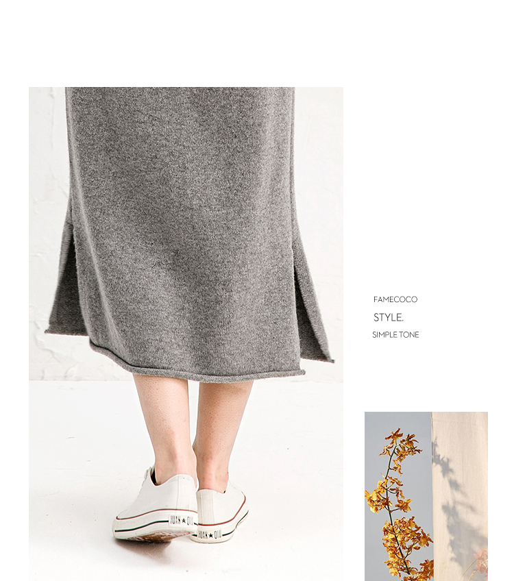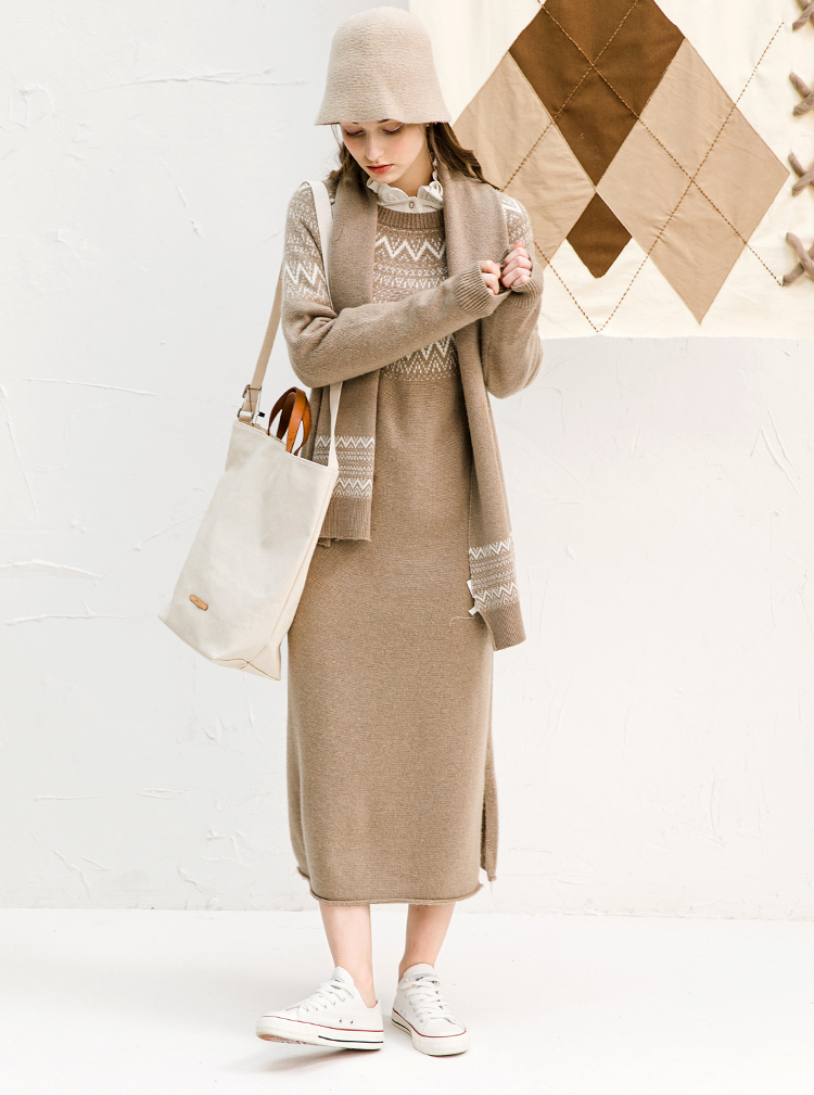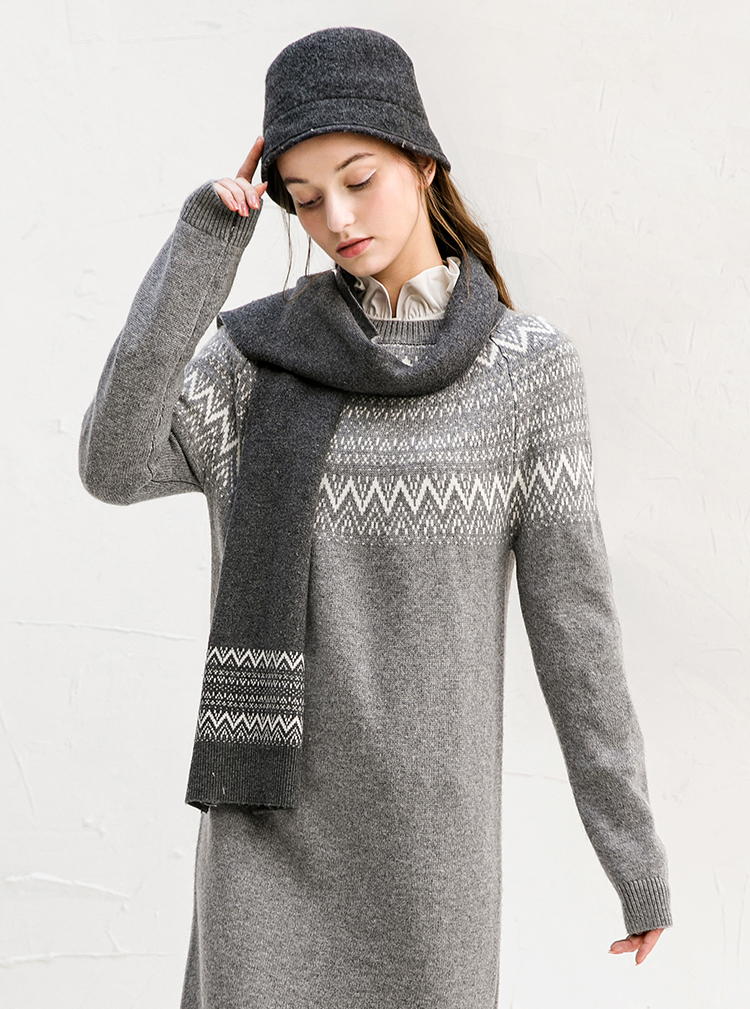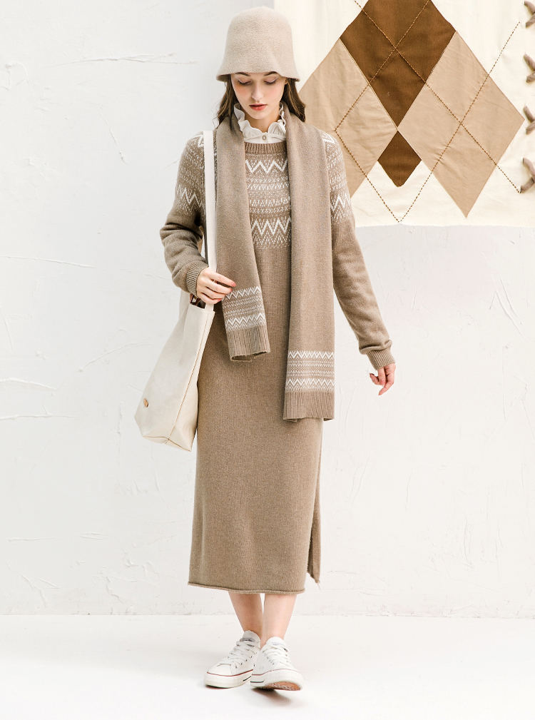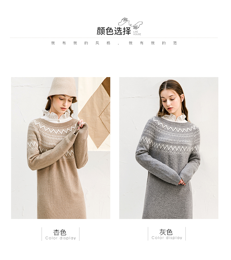 Famecoco范可儿长袖连衣裙秋冬复古提花针织长裙F218FA010