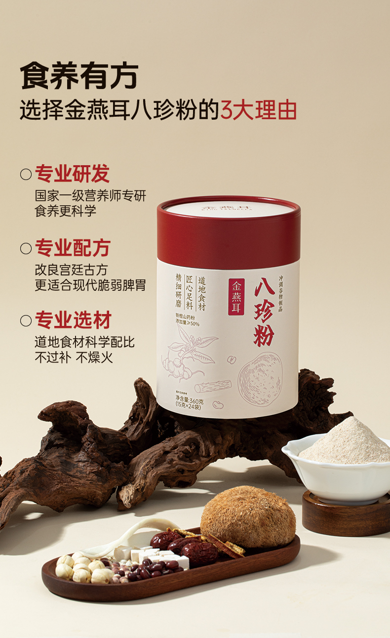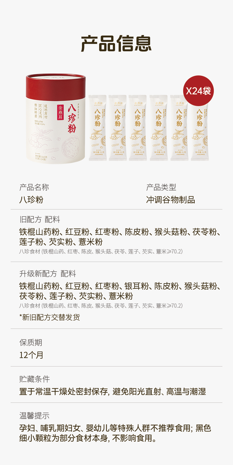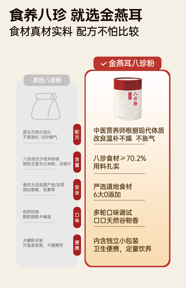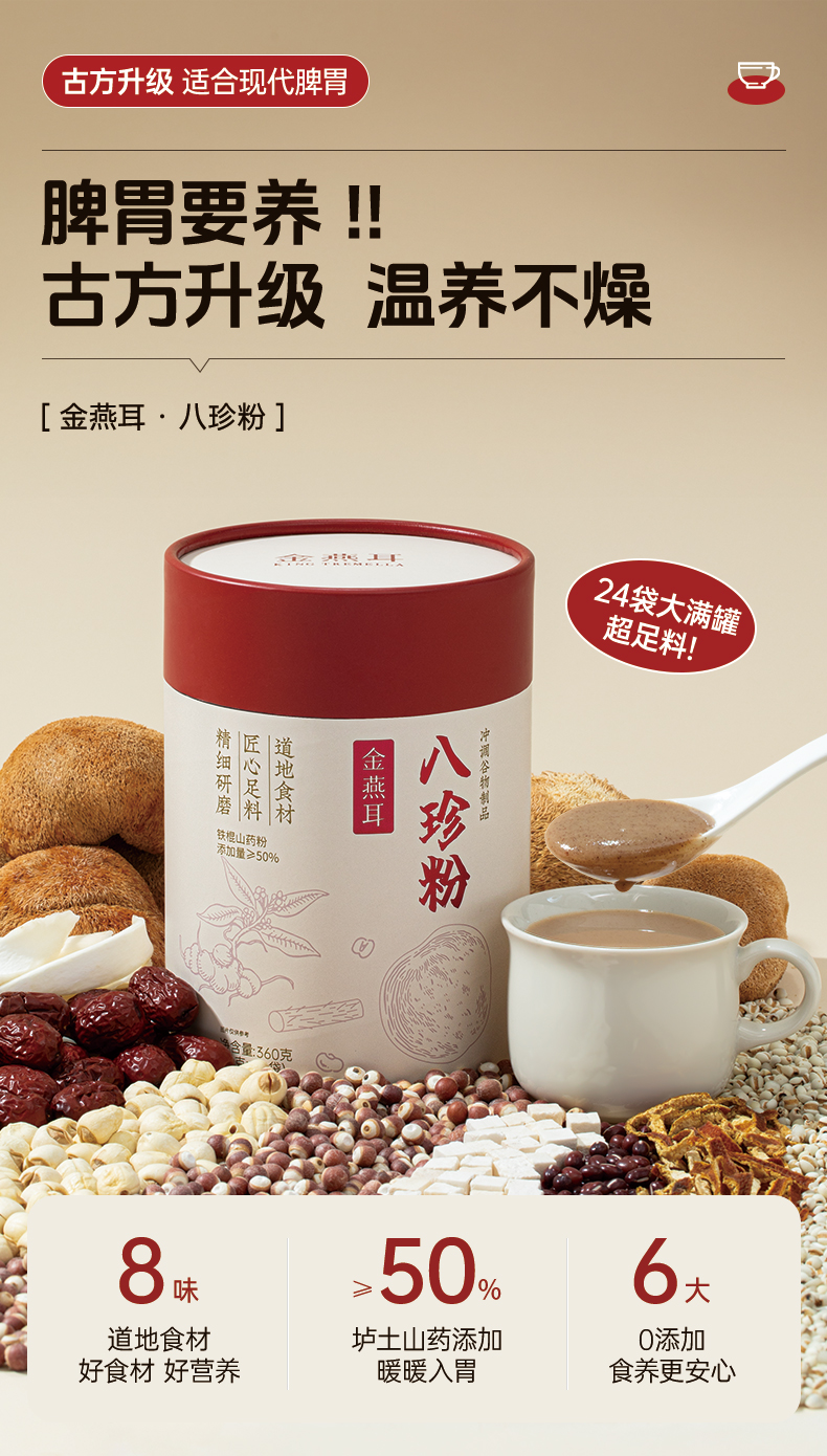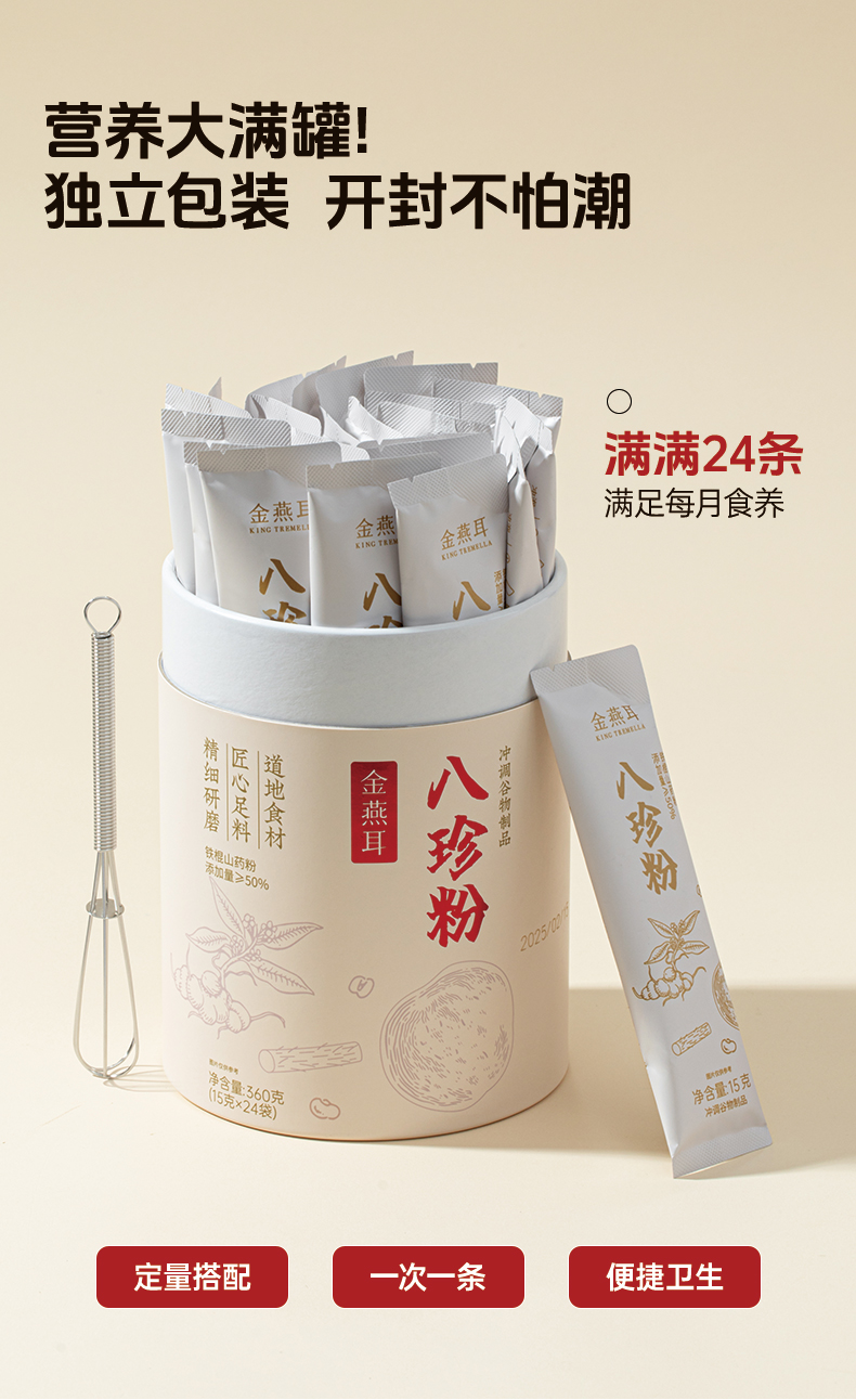 金燕耳铁棍山药八珍粉 古方升级 不燥不热 真正纯八珍粉 ≥70.2%八珍食材 不添加大米谷物片 营养早餐 24袋/罐 (再赠搅拌棒1个)