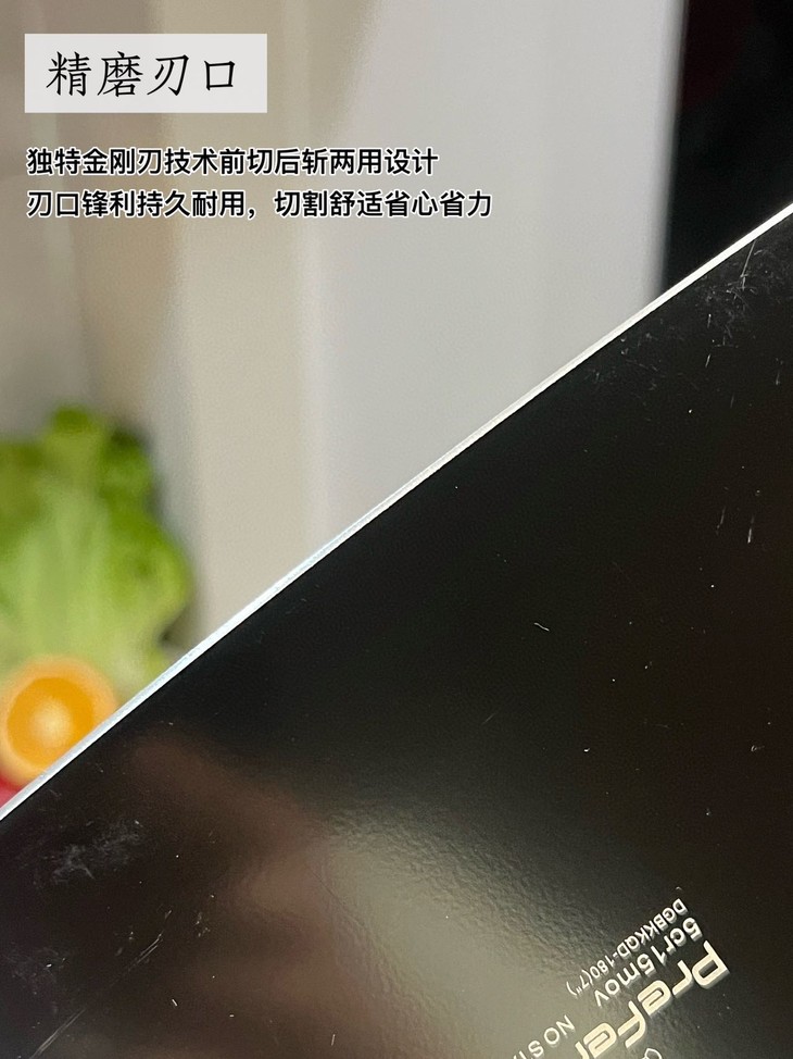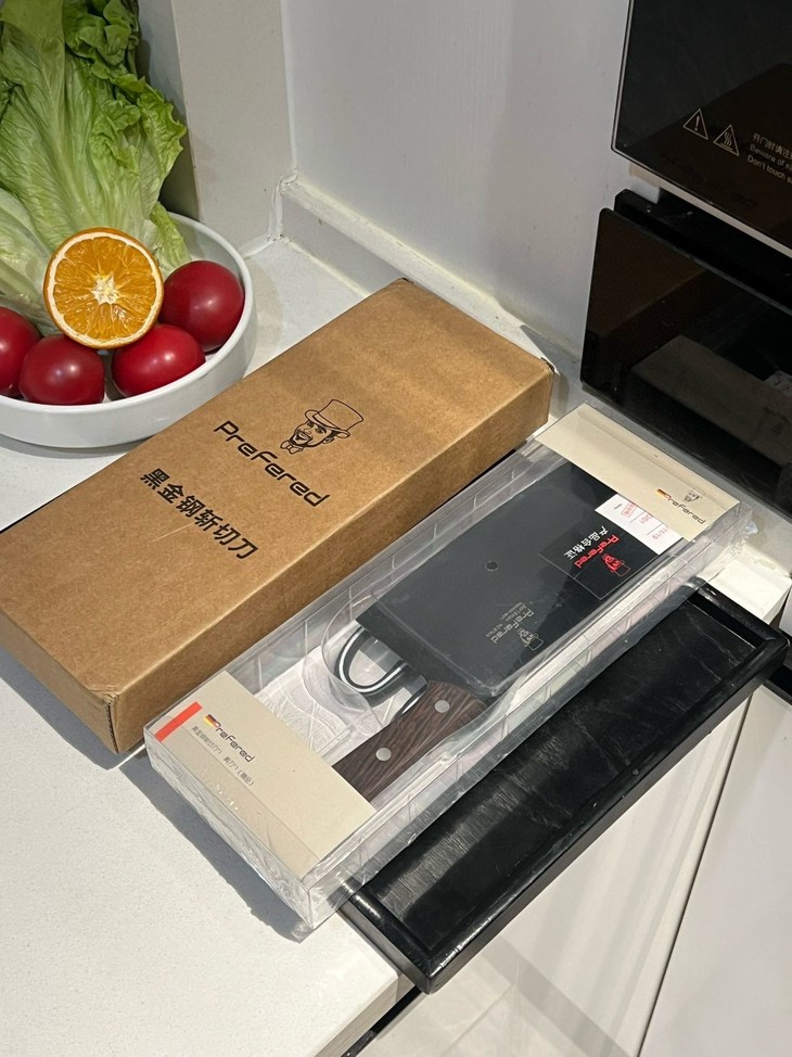 【prefered黑金钢斩切刀】优质钢材,采用5cr15mov钢材冷锻至58度,刀身一体成型,稳固耐用前切后斩,两用设计,采用欧标喷漆工艺,对人体无副作用,食品级接触经过第三方检测各项指标均合格.