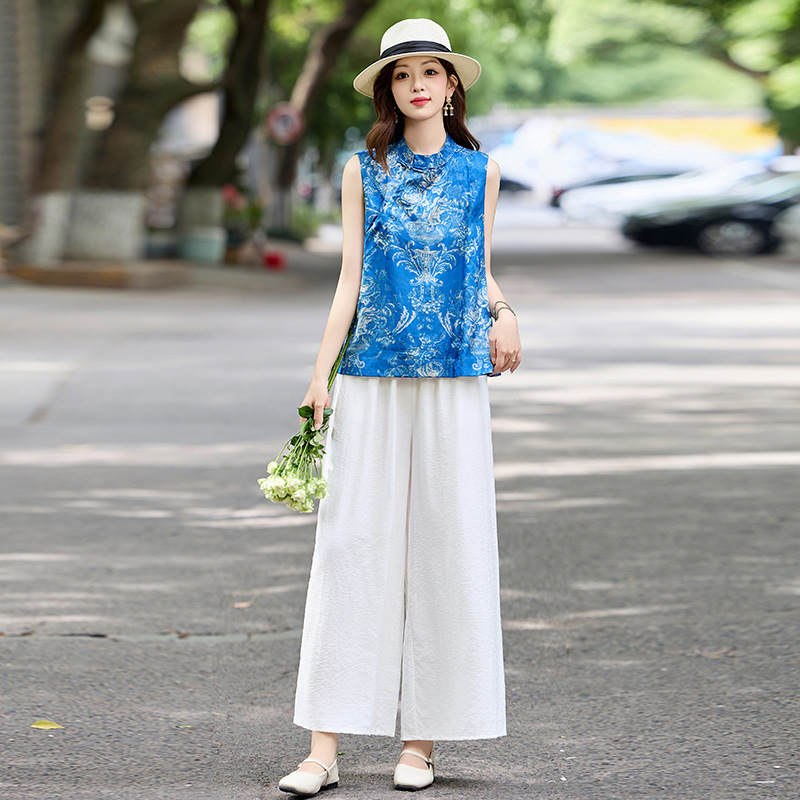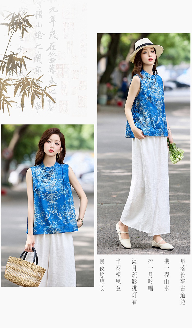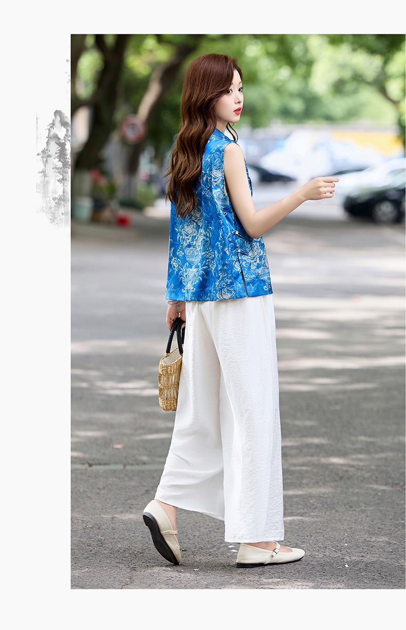 新中式国风轻奢高级感,复古印花阔腿裤减龄显瘦气质两件套HR-MCXZ8022