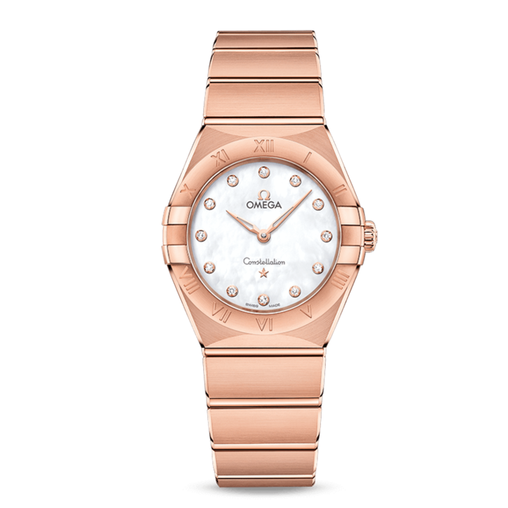 镜面材质 | 蓝宝石水晶玻璃 | 表盘 | 经典的半月形切面、“托爪”以及mono-rang表链。 Sedna® 18K金腕表,表圈镌刻罗马数字刻度,白色珍珠母贝表盘,饰有钻石小时刻度,覆以耐磨损蓝宝石玻璃表镜。表链、指针、欧米茄品牌标识、星座徽标以及钻石托槽亦以Sedna® 18K金打造而成。 密底,表背印有星座天文台徽章。 |