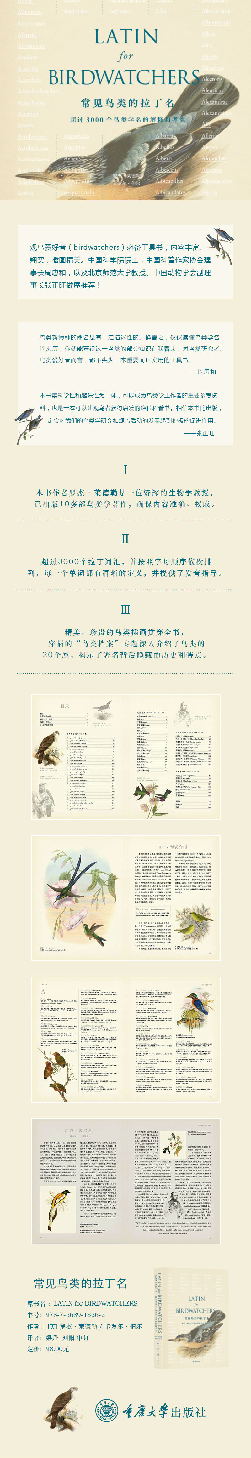 有了这本内容翔实、插图精美的书,鸟类爱好者们可以从拉丁学名中了解其蕴藏的丰富信息,并将其运用到观鸟活动中去,令观鸟活动变得更加容易、有趣。