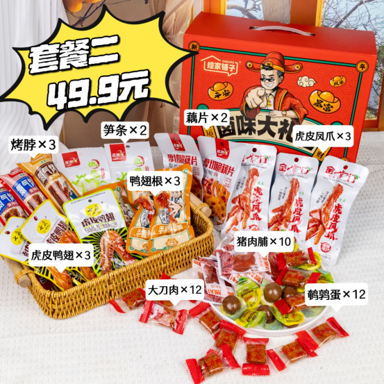 🌈礼盒二(选择困难症买这款,种类超级多,挨个儿尝尝) 💰49.9元,共50包 ✅3包氮气烤脖(香辣味+黑鸭味) ✅3包手撕鸭翅根(酱卤味) ✅3包虎皮鸭翅(黑鸭味+五香味) ✅3包虎皮凤爪(香辣味) ✅2包笋条(泡椒味) ✅2包藕片(香辣味) ✅12包大刀肉(香辣味) ✅12颗卤鹌鹑蛋(五香味 ) ✅10包猪肉脯(原味/香辣味/蜜汁味)