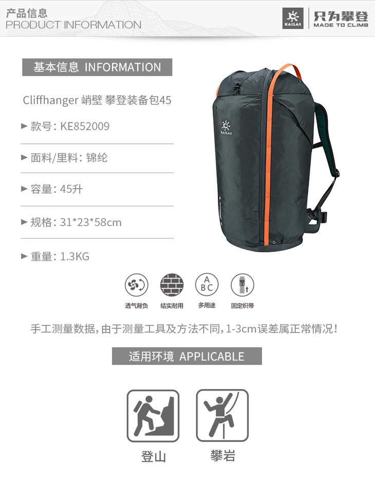 KAILAS/凯乐石 Cliffhanger 峭壁 攀登装备包 救援 攀登 45升 KE852009