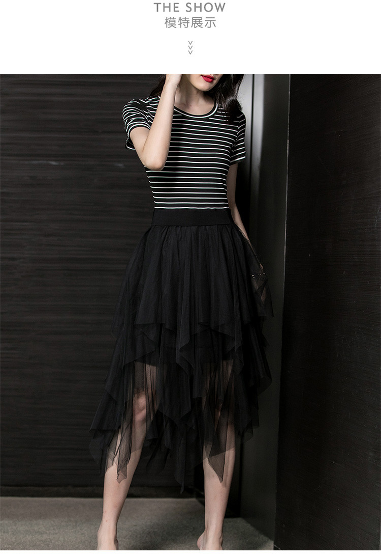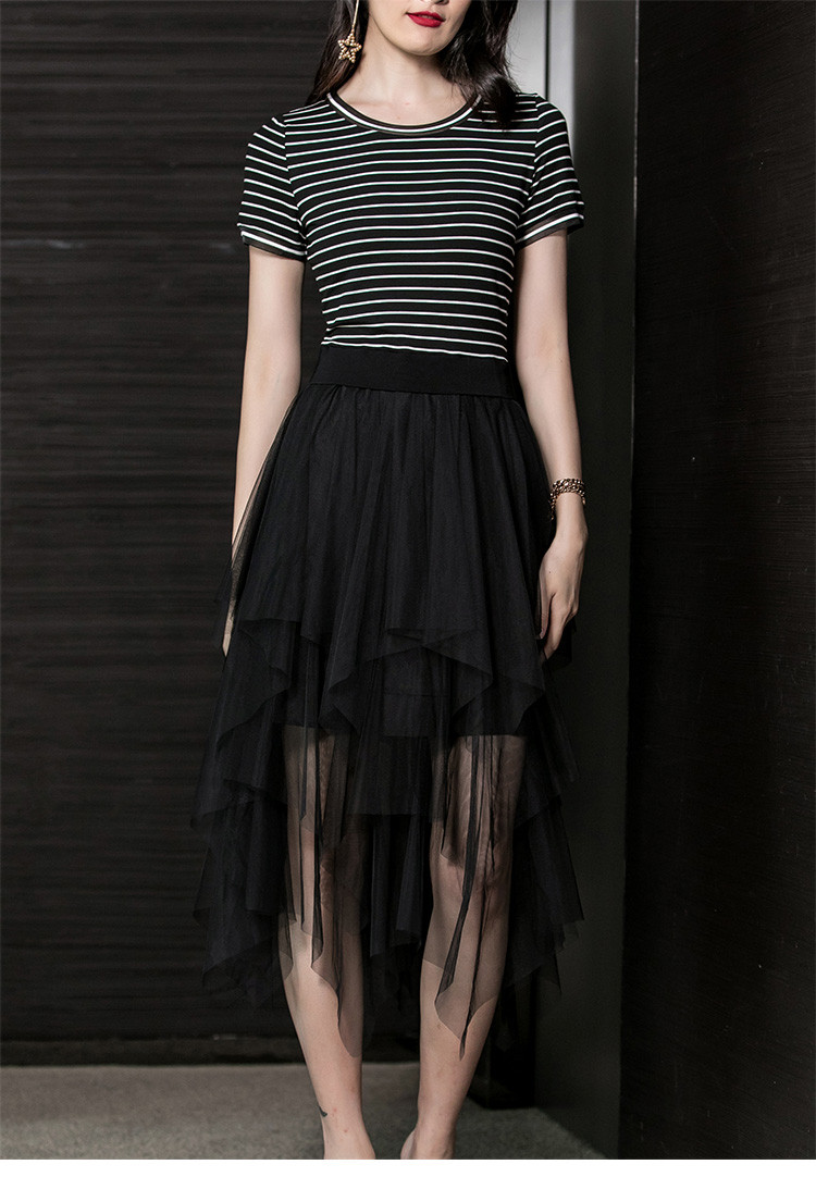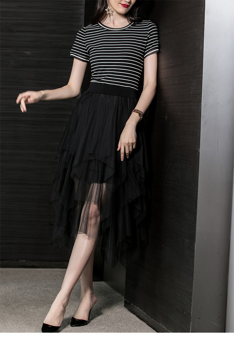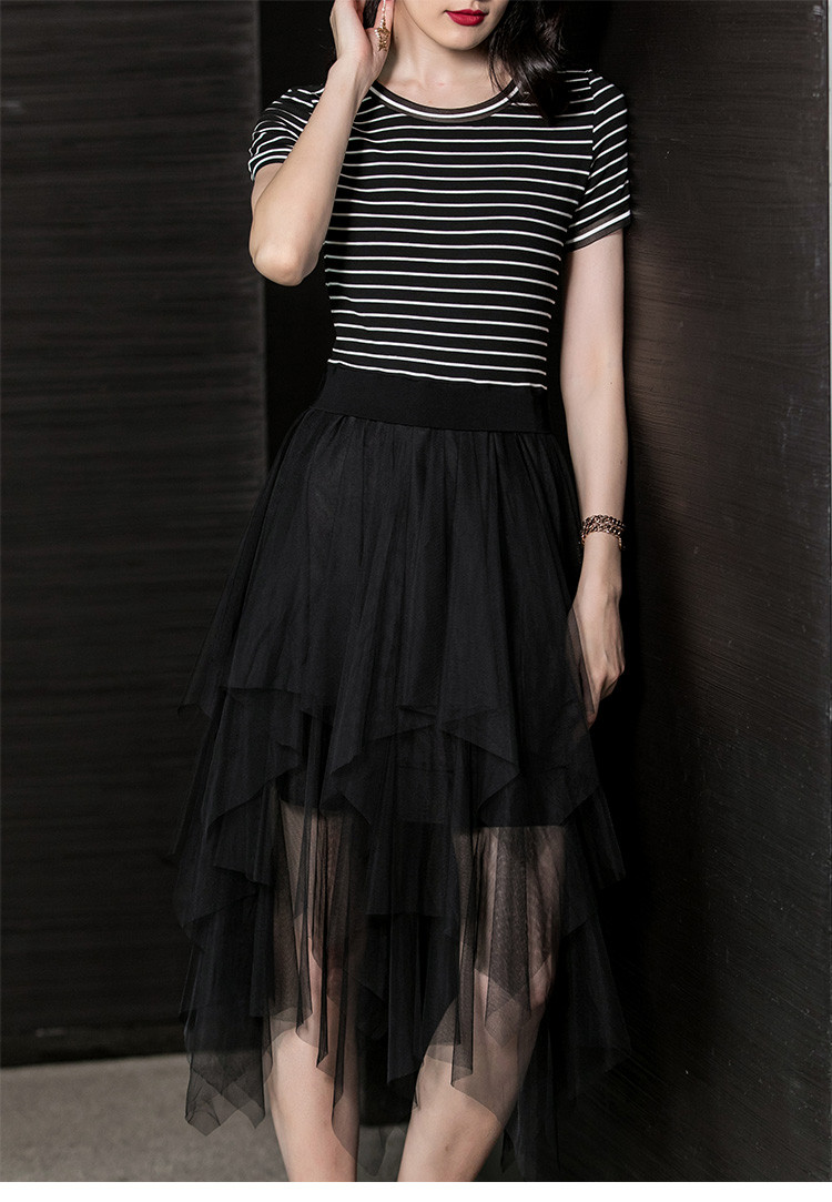 芳外芳外优雅气质中长裙休闲时尚条纹网纱拼接假两件连衣裙
