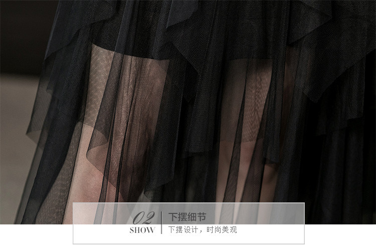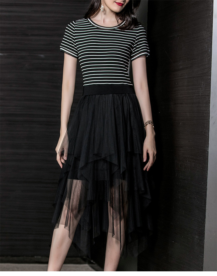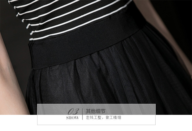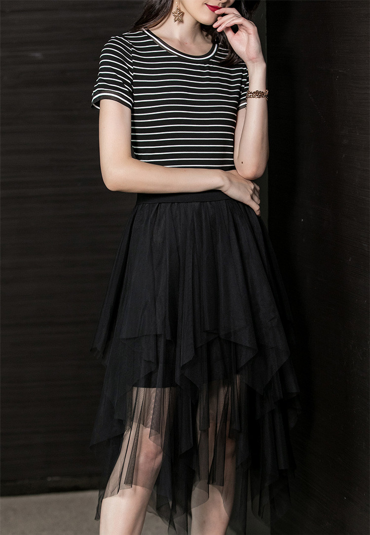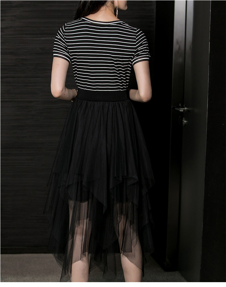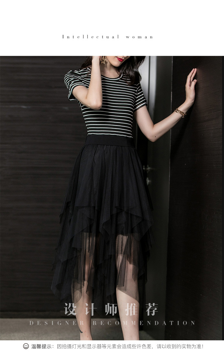 芳外芳外优雅气质中长裙休闲时尚条纹网纱拼接假两件连衣裙