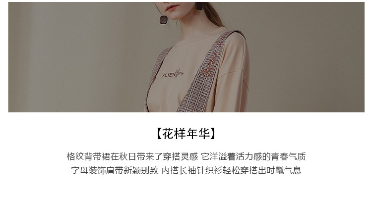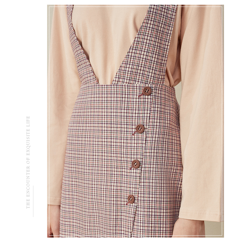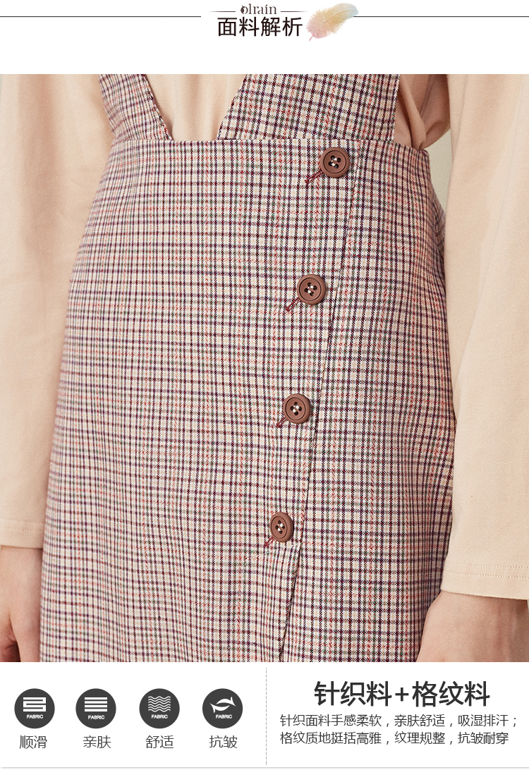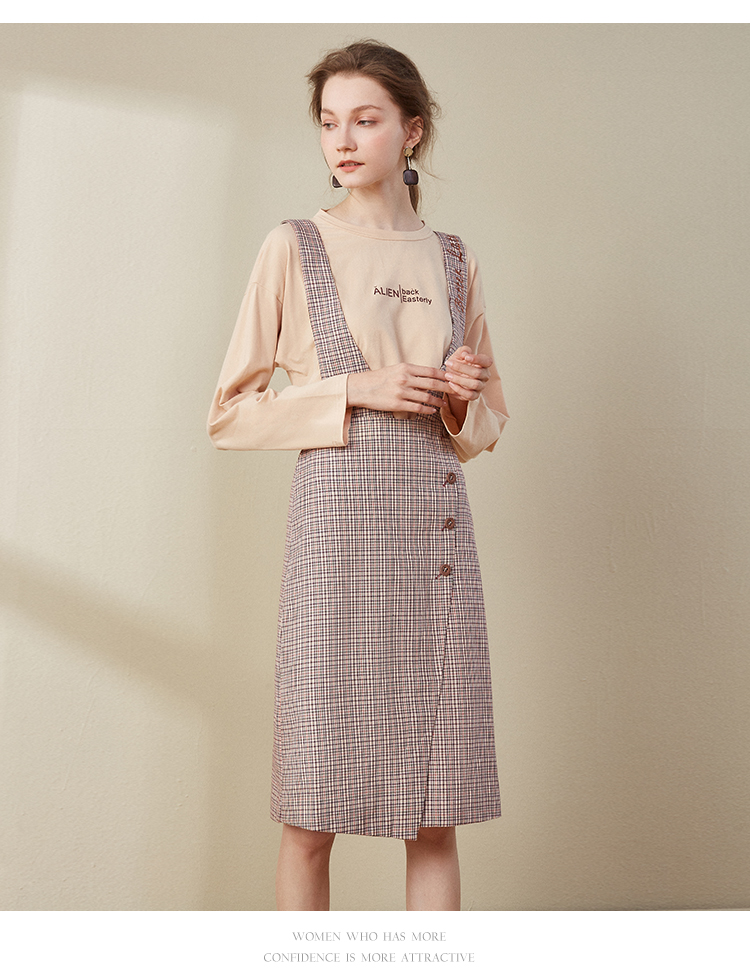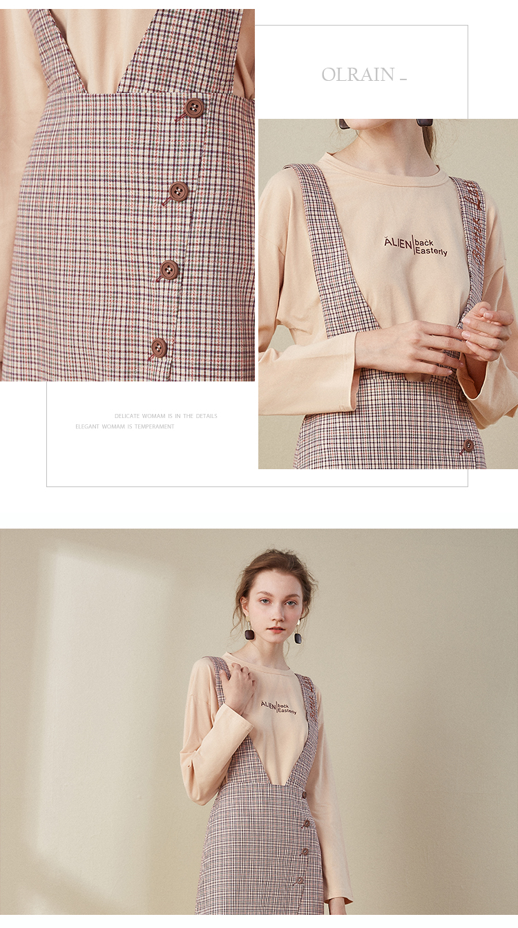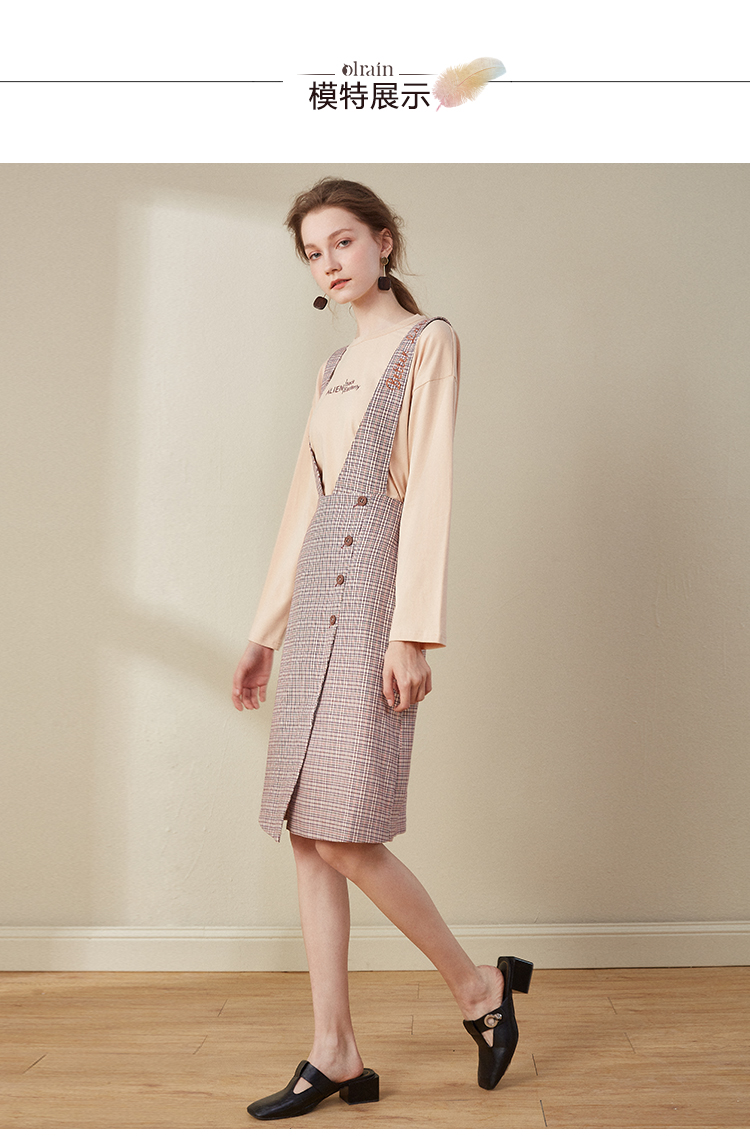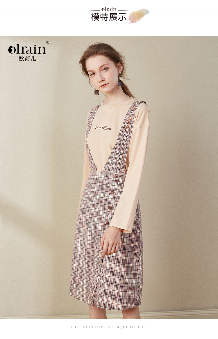 欧芮儿2018秋装新款长袖上衣女格子背带连衣裙女中长款套装