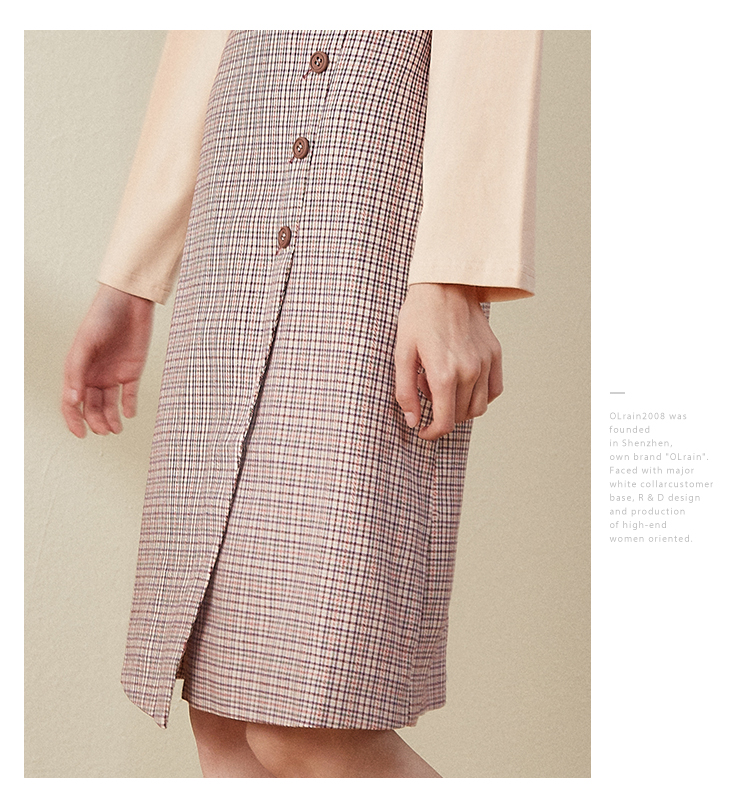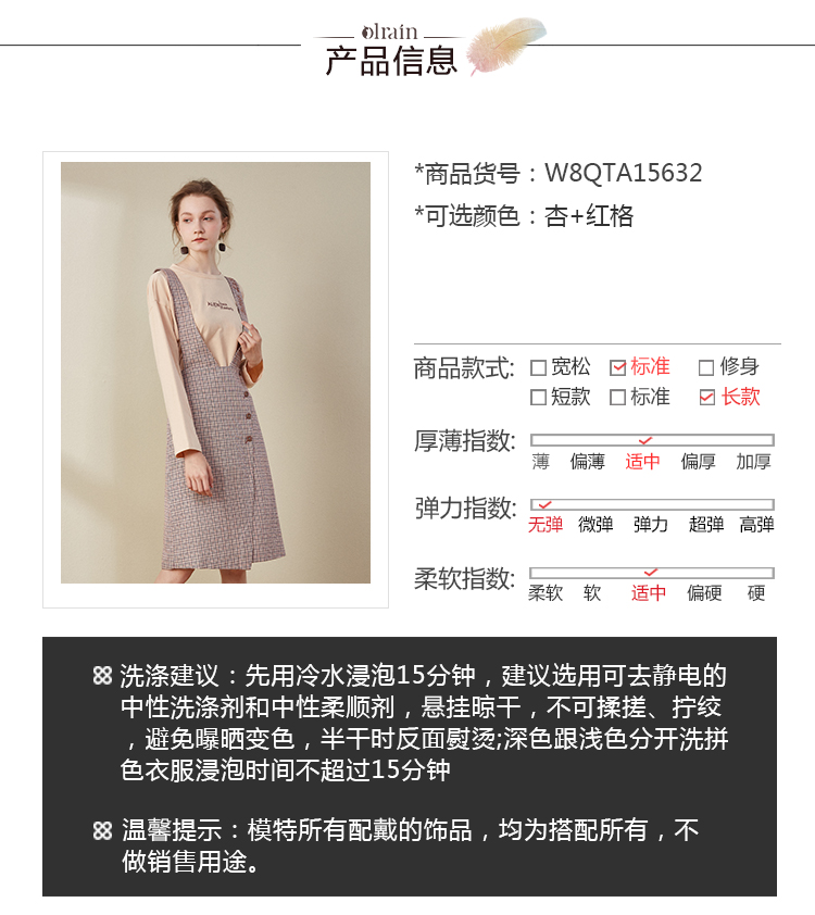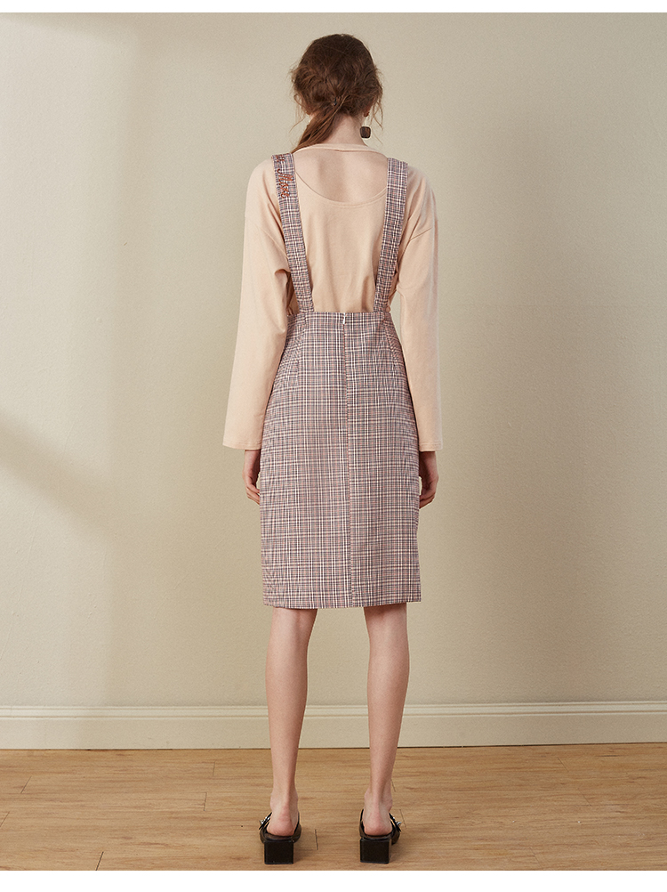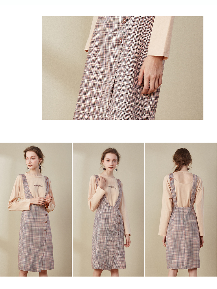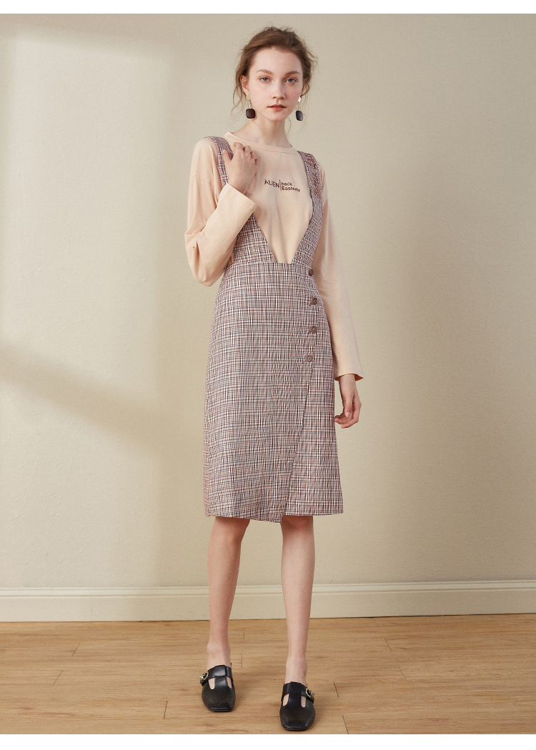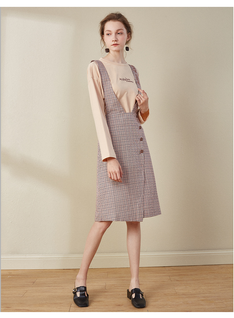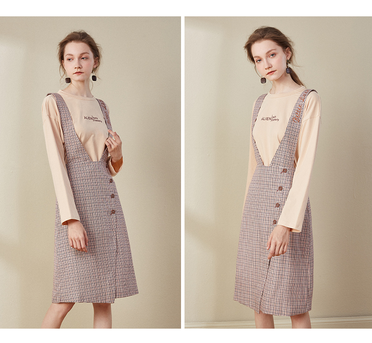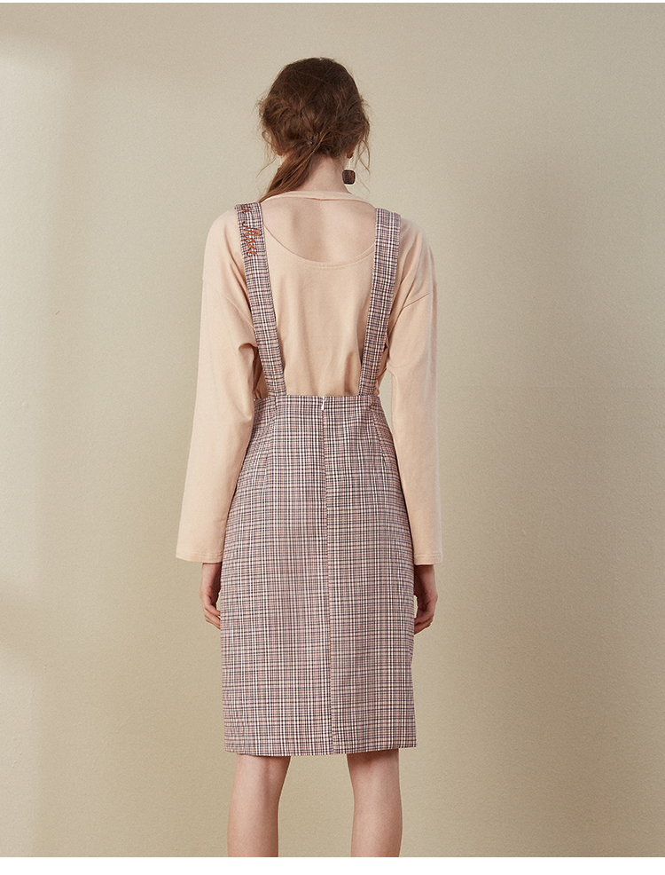 欧芮儿2018秋装新款长袖上衣女格子背带连衣裙女中长款套装