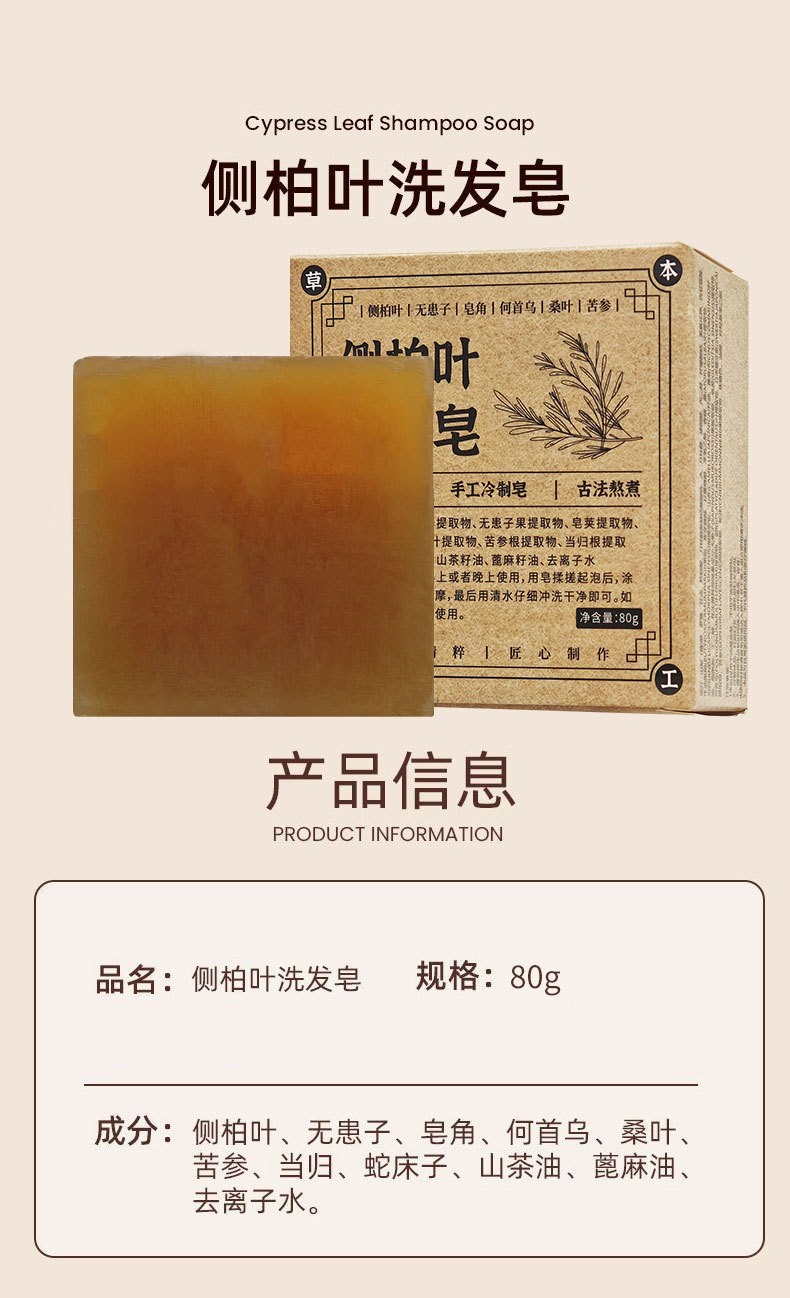 「9.9到手3盒!三合一」雅屏侧柏叶洗发皂 植物精华手工熬制无硅油居家日用天然植物草本纯手工 商品图4