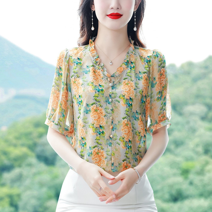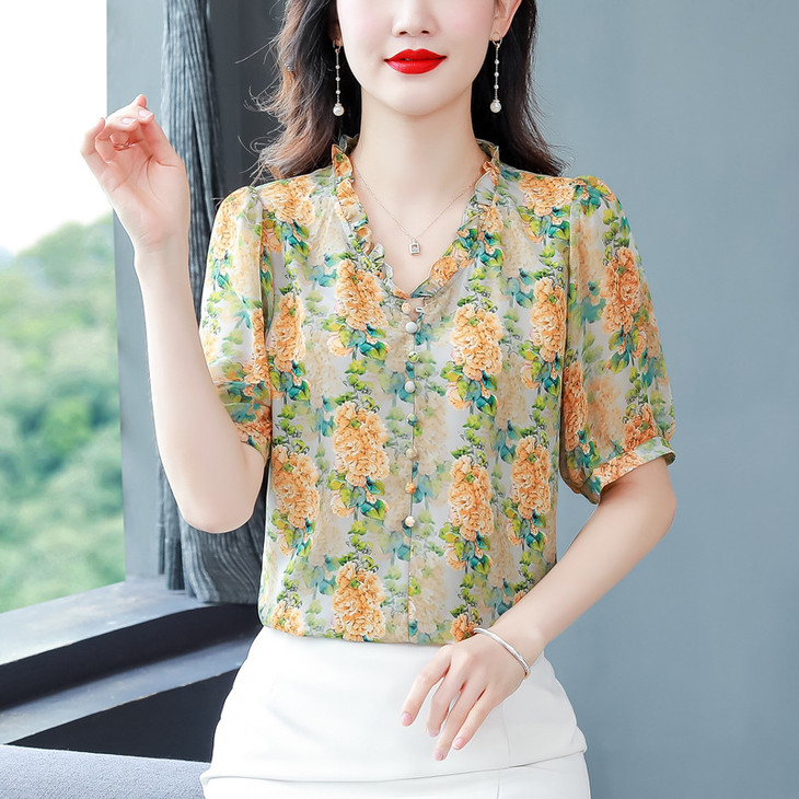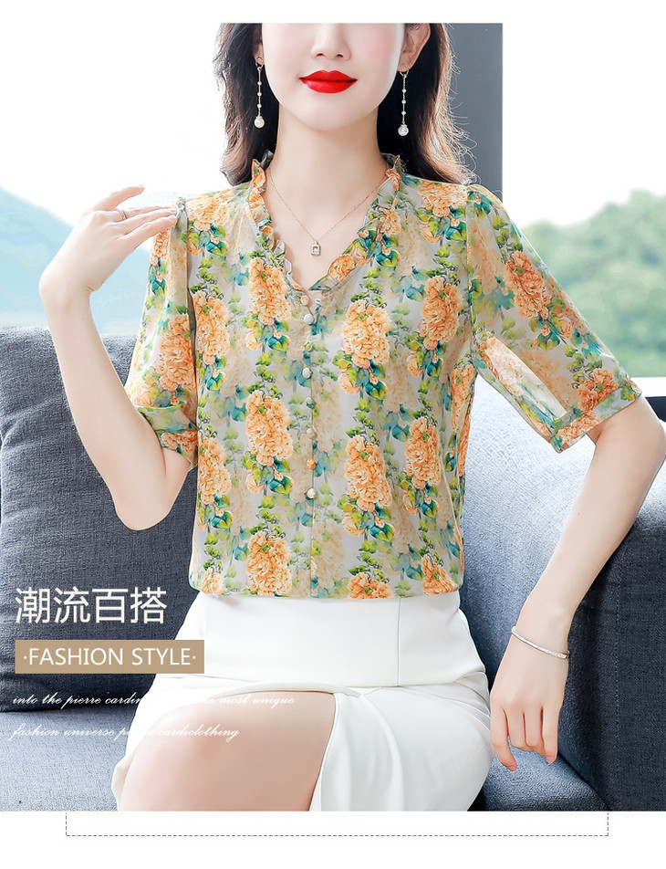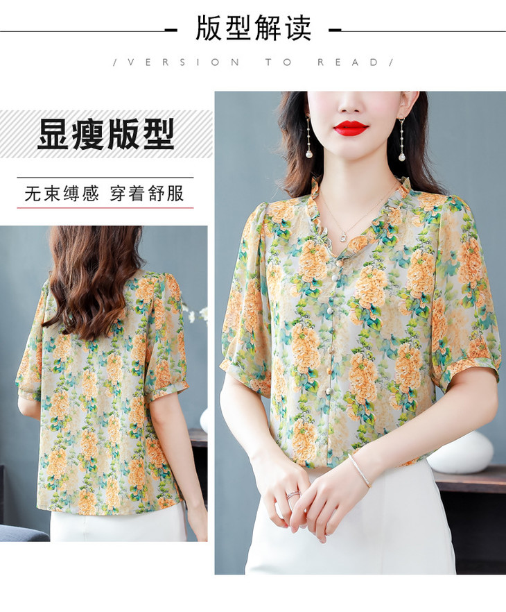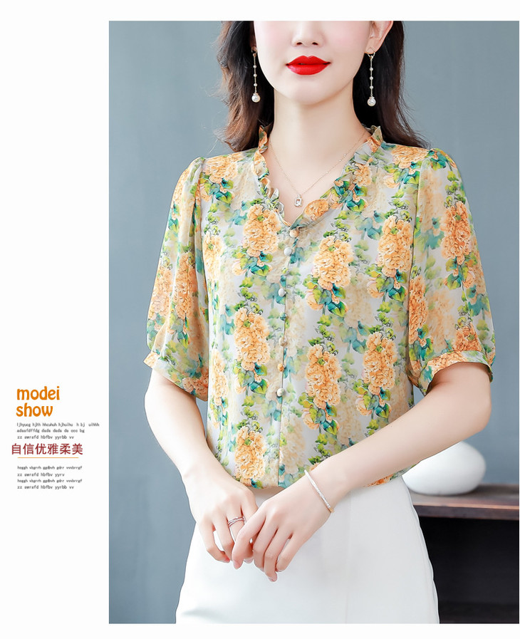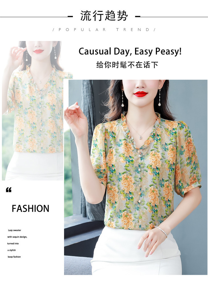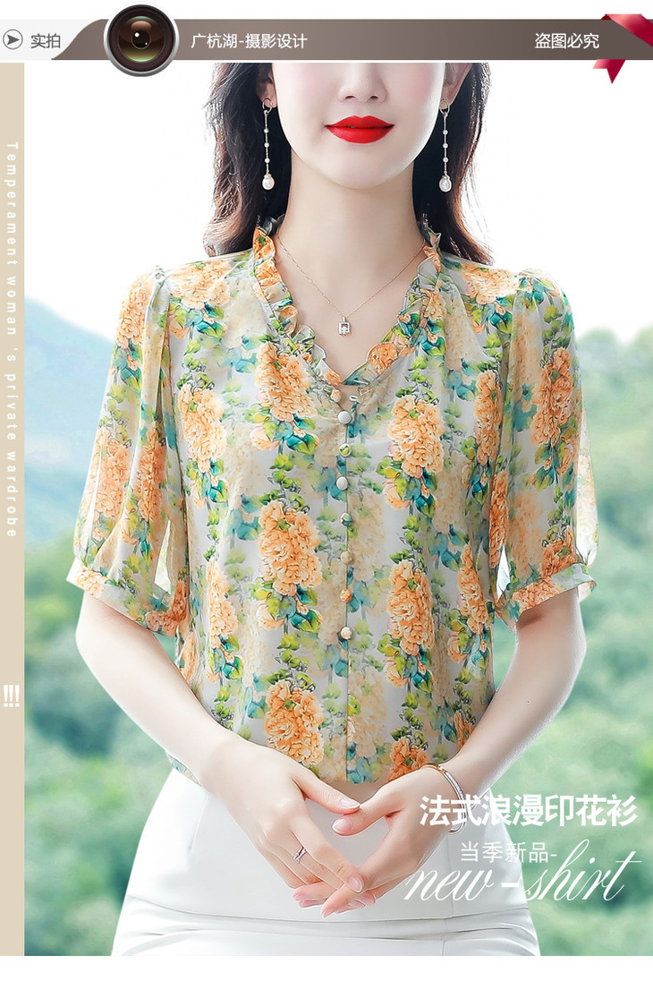 法式浪漫印花短袖小衫,花边褶皱V领T恤上衣AHM-myl579