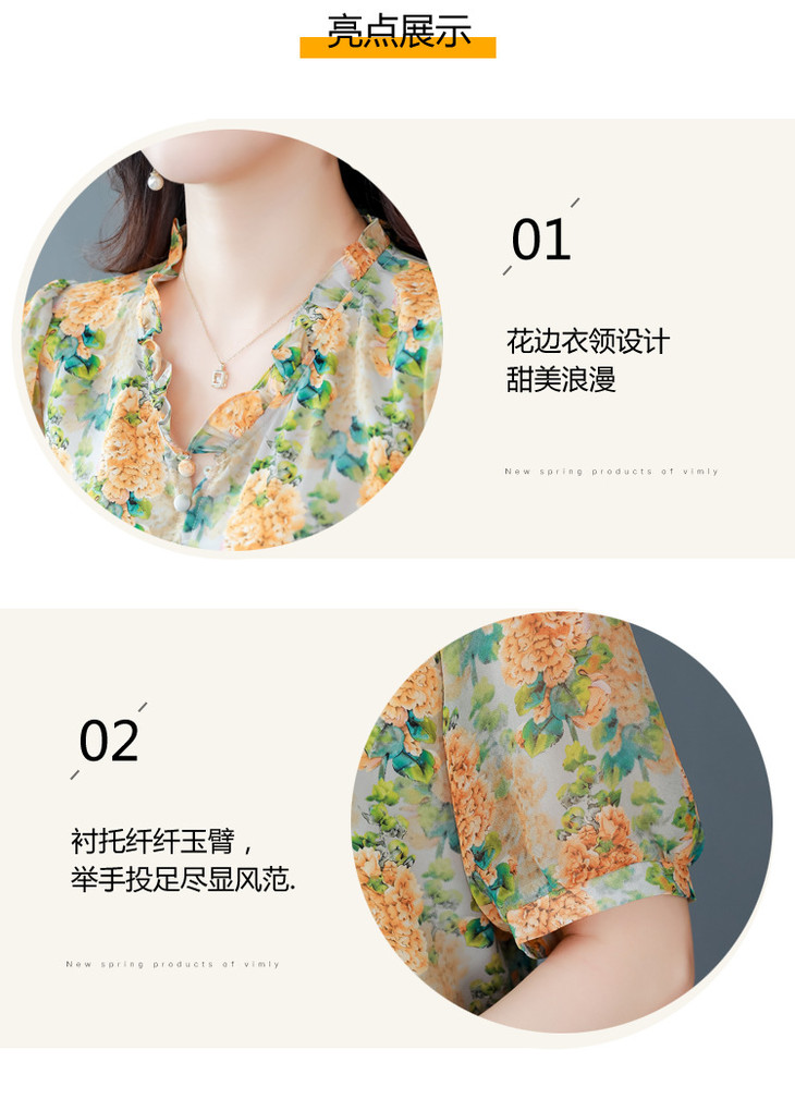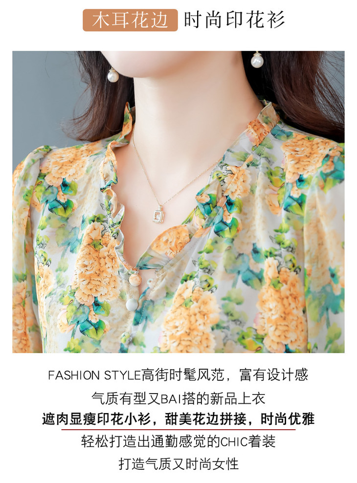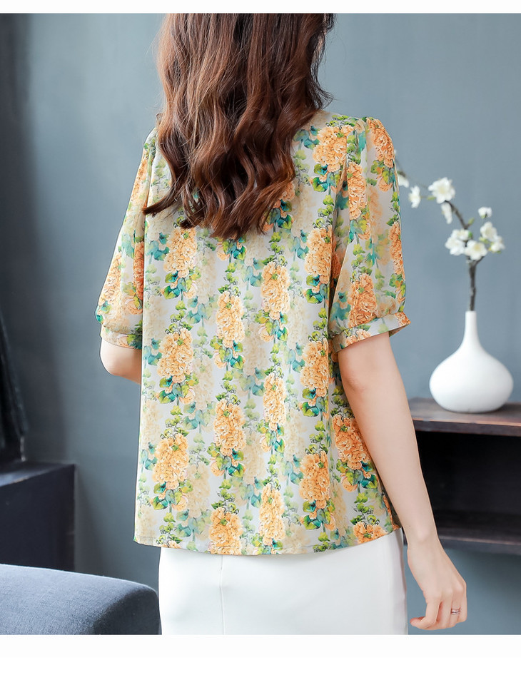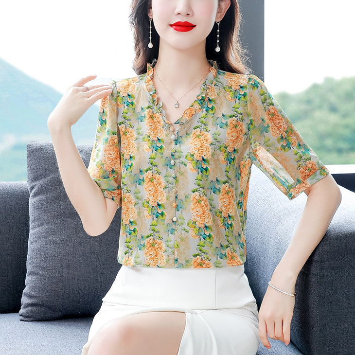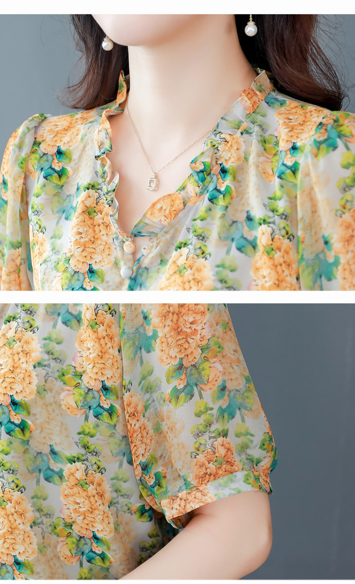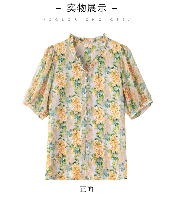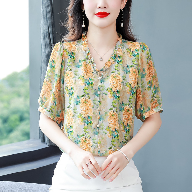 法式浪漫印花短袖小衫,花边褶皱V领T恤上衣AHM-myl579