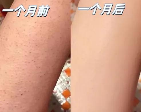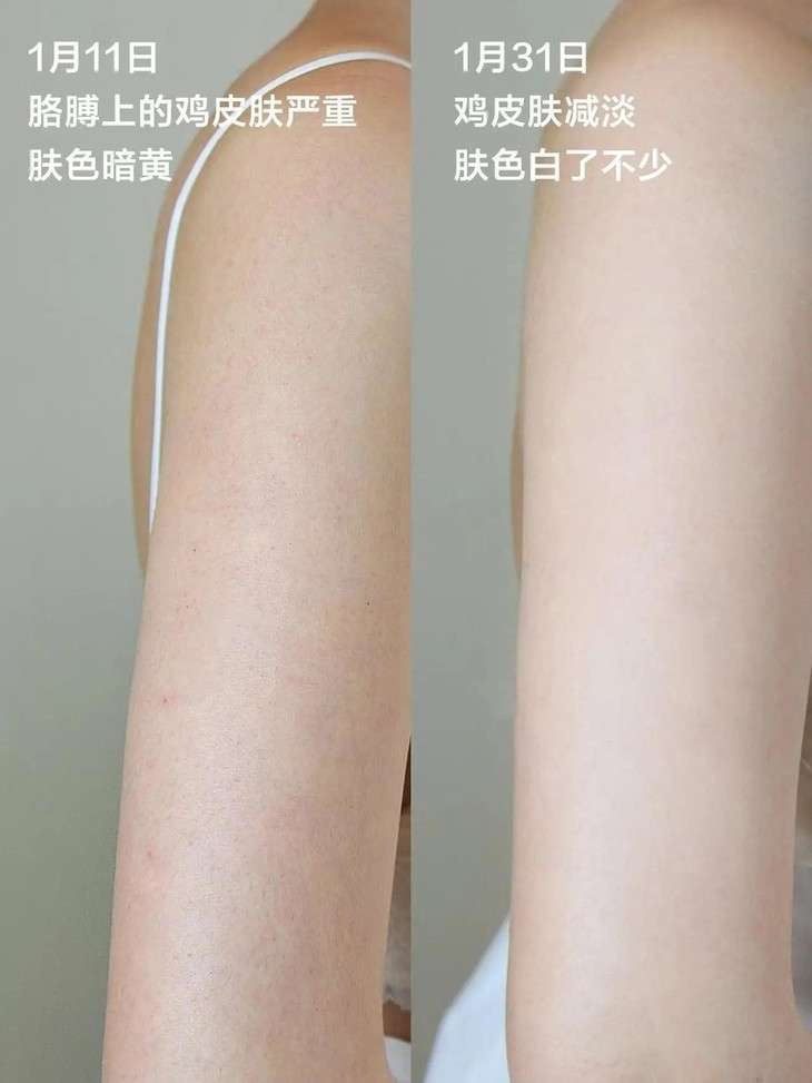 奉上去鸡皮实秀—— 原本明显的鸡皮,在坚持使用了一段时间后 明显看到鸡皮变化,让你有图有真相的看到: 左:没涂身体乳前,鸡皮肌肤问题明显 右:坚持涂身体乳后,同一个位置,减少了许多