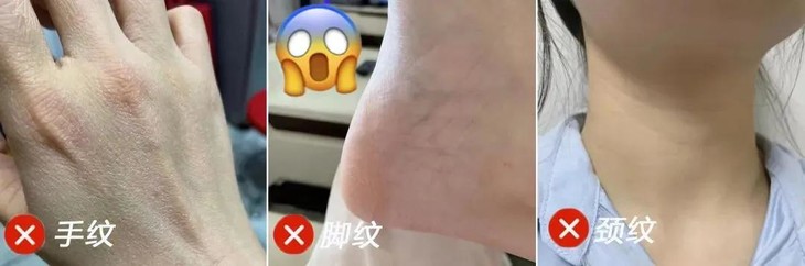 放大仔细对比: 抹了身体乳的双手纹路更细,皮褶都被撑了起来