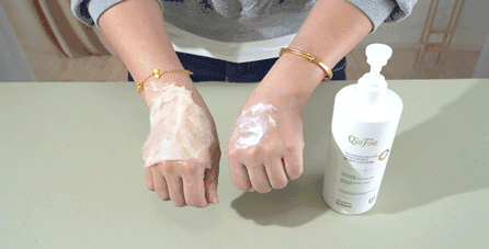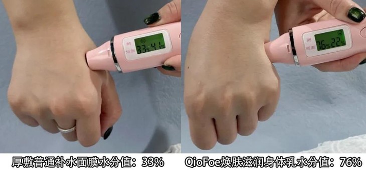 我们用补水面膜和这款身体乳 来测试对比一下补水力: 左手:敷一张补水面膜 手:厚敷QioFoe焕肤滋润身体乳