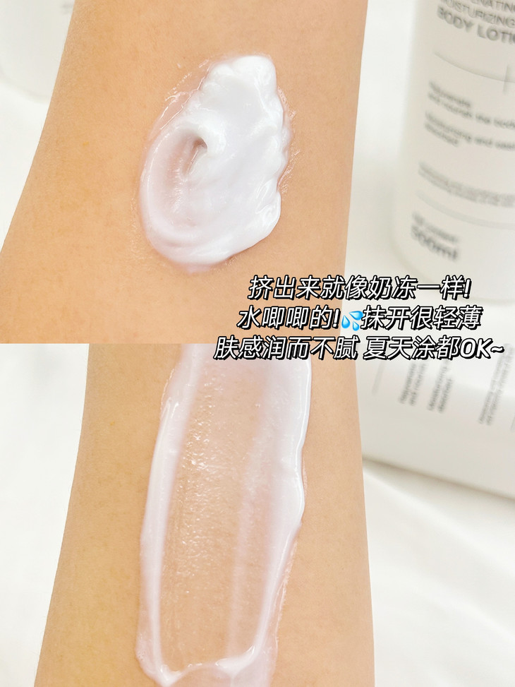 我自己用下来也是一整个爱住! 肤感和质地远甩普通身体乳一条街: 质地像粘稠版乳液,一抹化水 “唰唰”两下就直接被“吃”进了皮肤里。