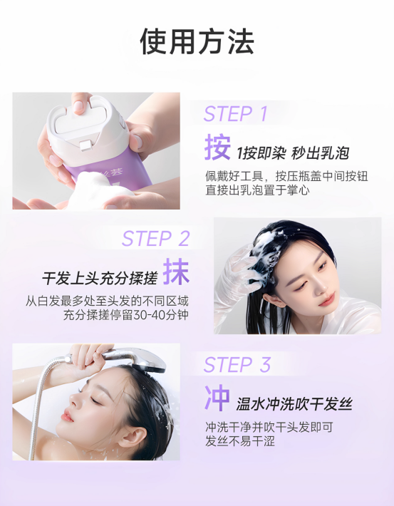▪️不用搅拌,不用分区,更不用刷染! 只需轻轻一按挤出染发膏,上手直接涂抹, 三步搞定!哪怕是染发小白, 也能染出均匀好看的发色~ 省时省力的代名词!染发出众更护发!