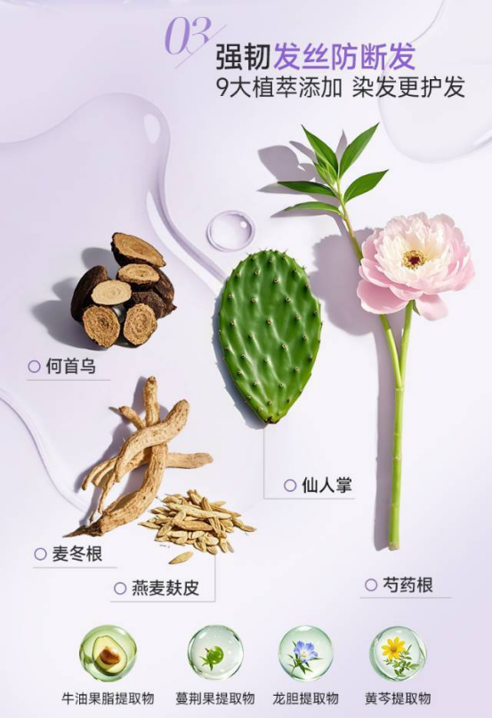 🔸9种植物精粹 从何首乌 、麦冬、燕麦、芍药、牛油果、 仙人掌、蔓荆果、龙胆、黄芩中提取优质精华, 染发更护发,有效避免头发损伤 成分实打实添加:从头皮到发丝全方位呵护, 染发的同事还能滋养头皮、强韧发丝, 敏感头皮也能安心冲!