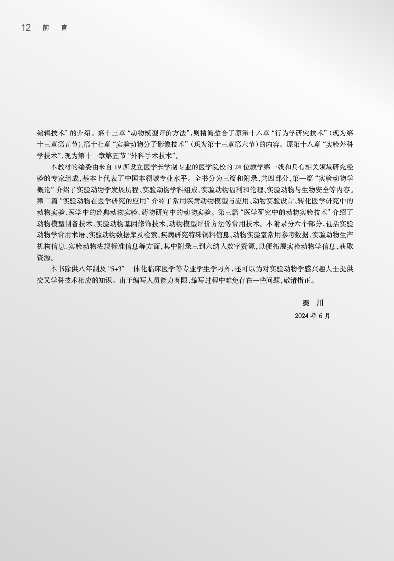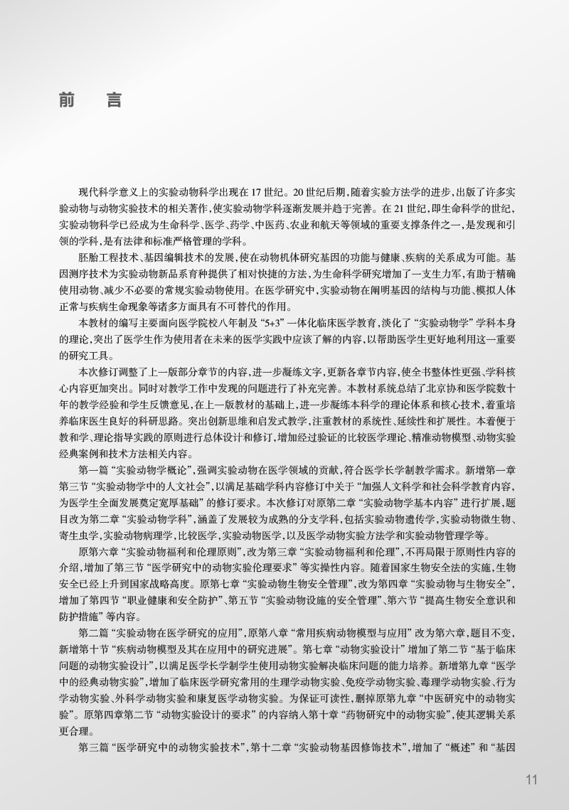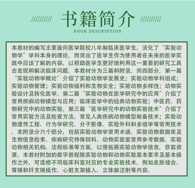 本教材的编写主要面向医学院校八年制及“5+3”一体化临床医学教育,淡化了“实验动物学”学科本身的理论,突出了医学生作为使用者在未来的医学实践中应该了解的内容,以帮助医学生更好地利用这一重要的研究工具。