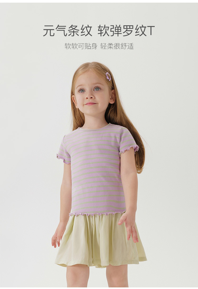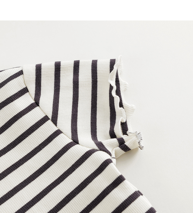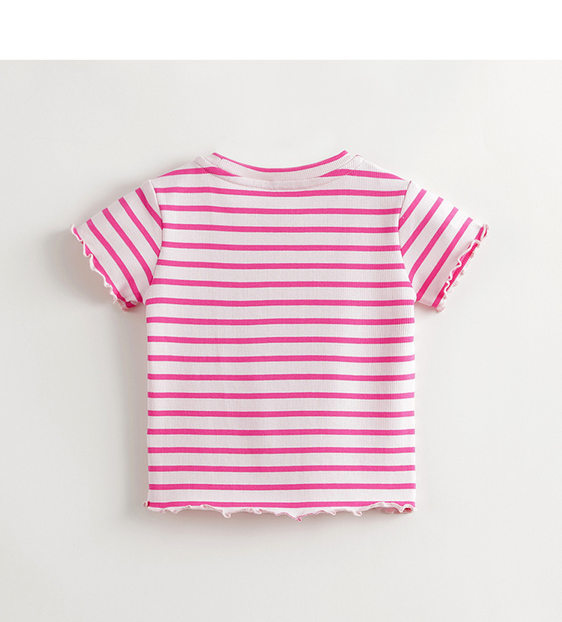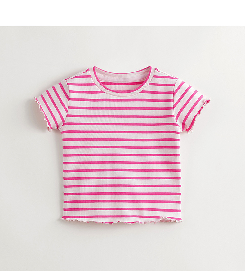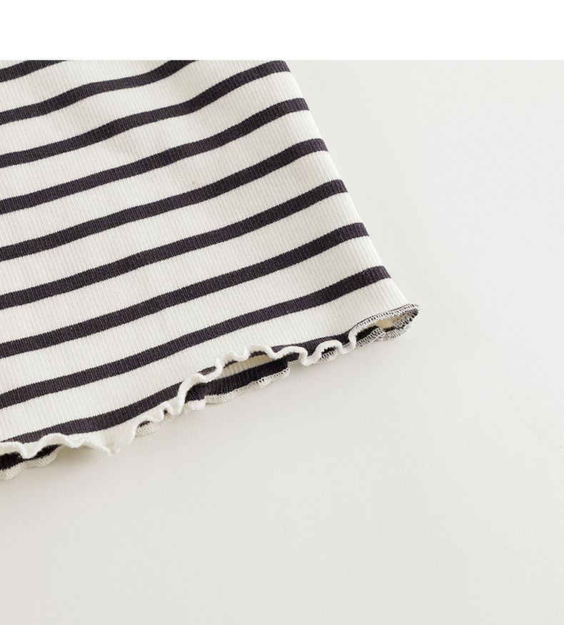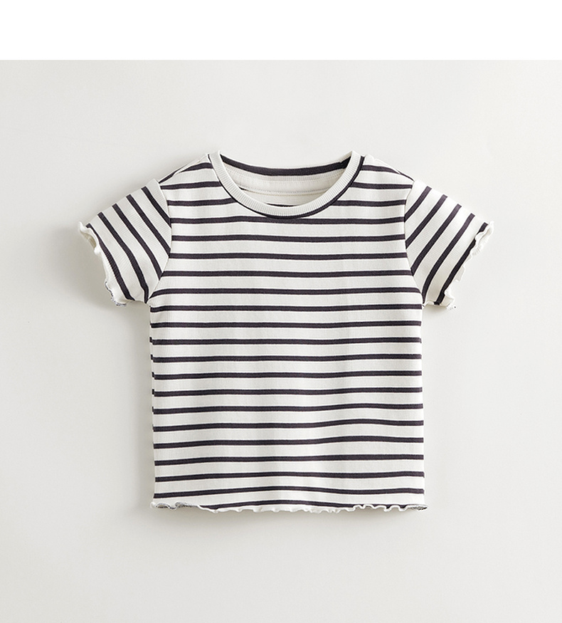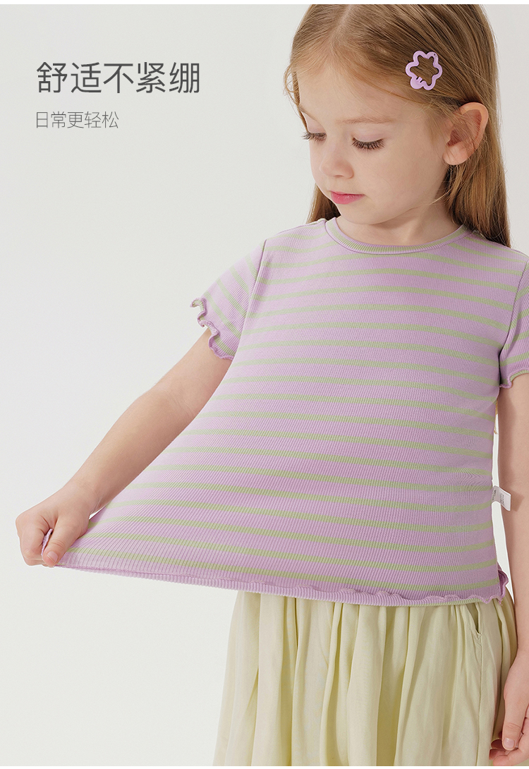 马克珍妮女童弹力针织波浪边条纹短袖T恤儿童上衣夏装新款240721