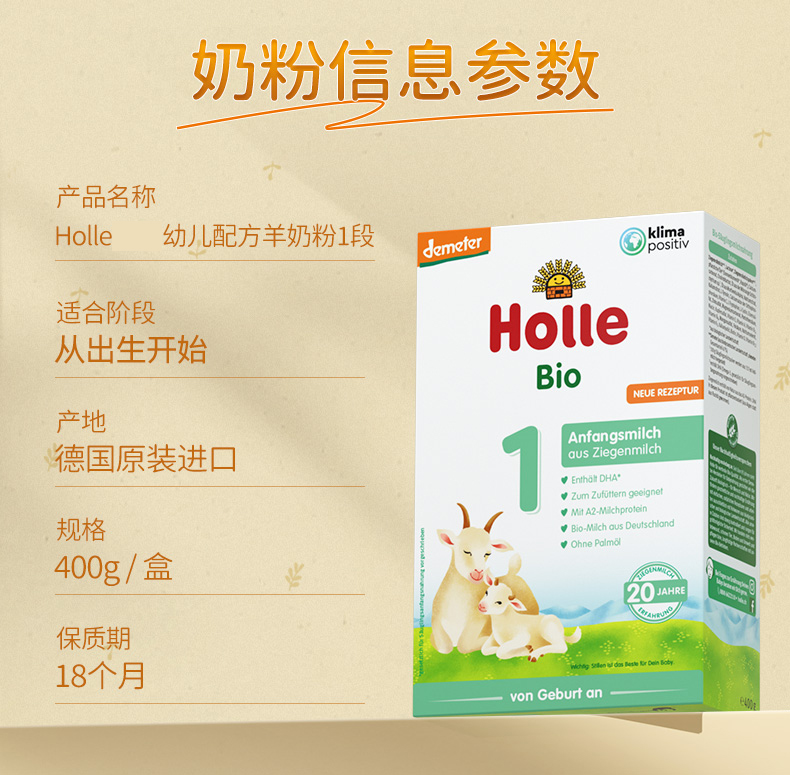 【跨境进口】1段羊奶粉 | Holle泓乐 婴儿配方羊奶粉1段0-6个月400g德国原装进口(跨境商品报关后不支持退货,介意慎拍)