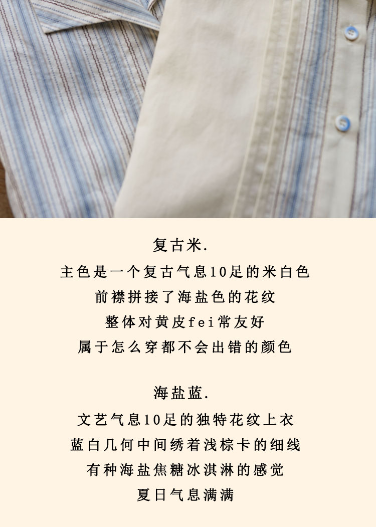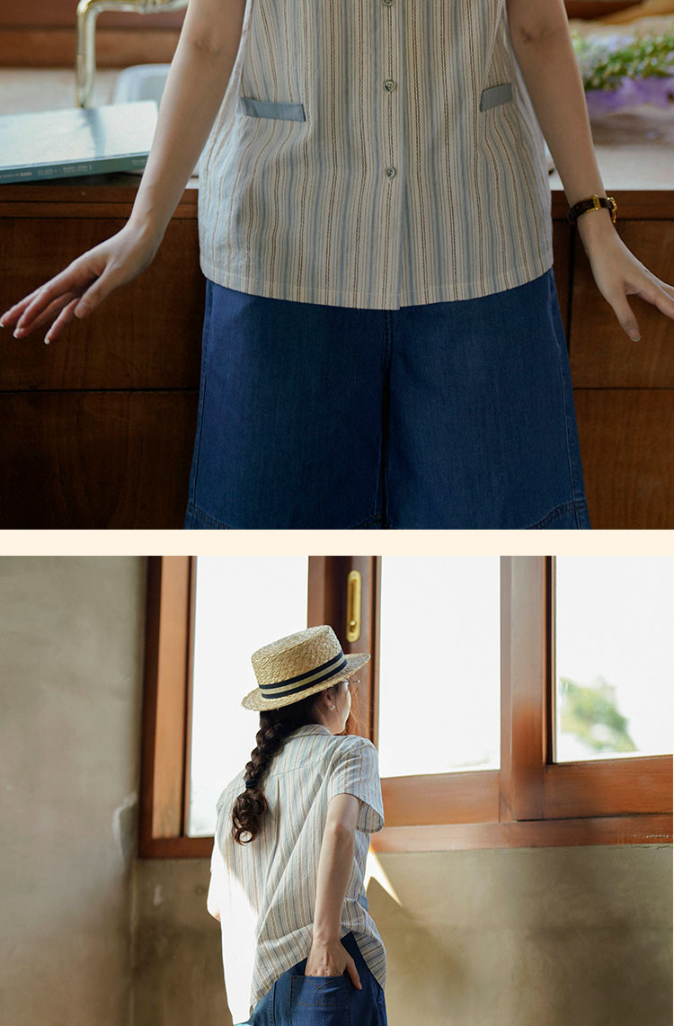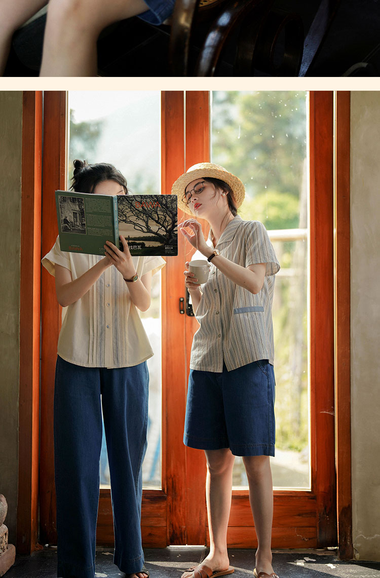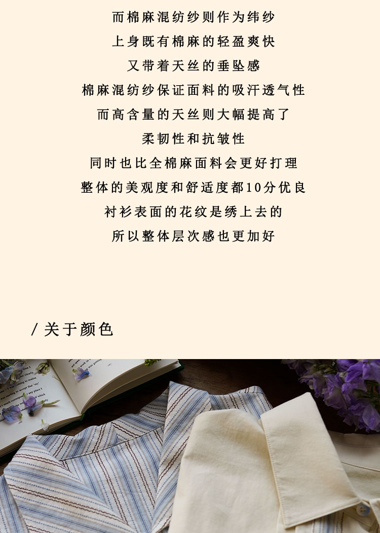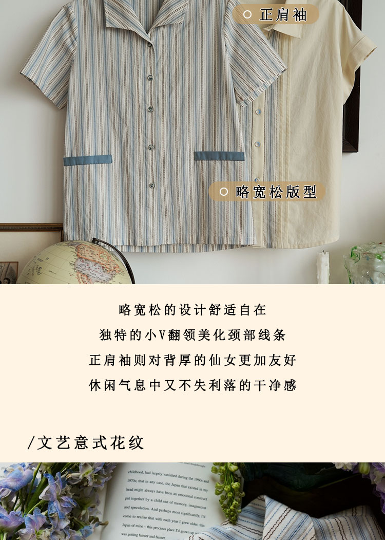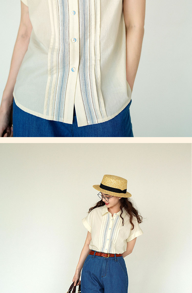 浮生八记/22B052/22B041/天丝棉麻拼接条纹刺绣短袖衬衫