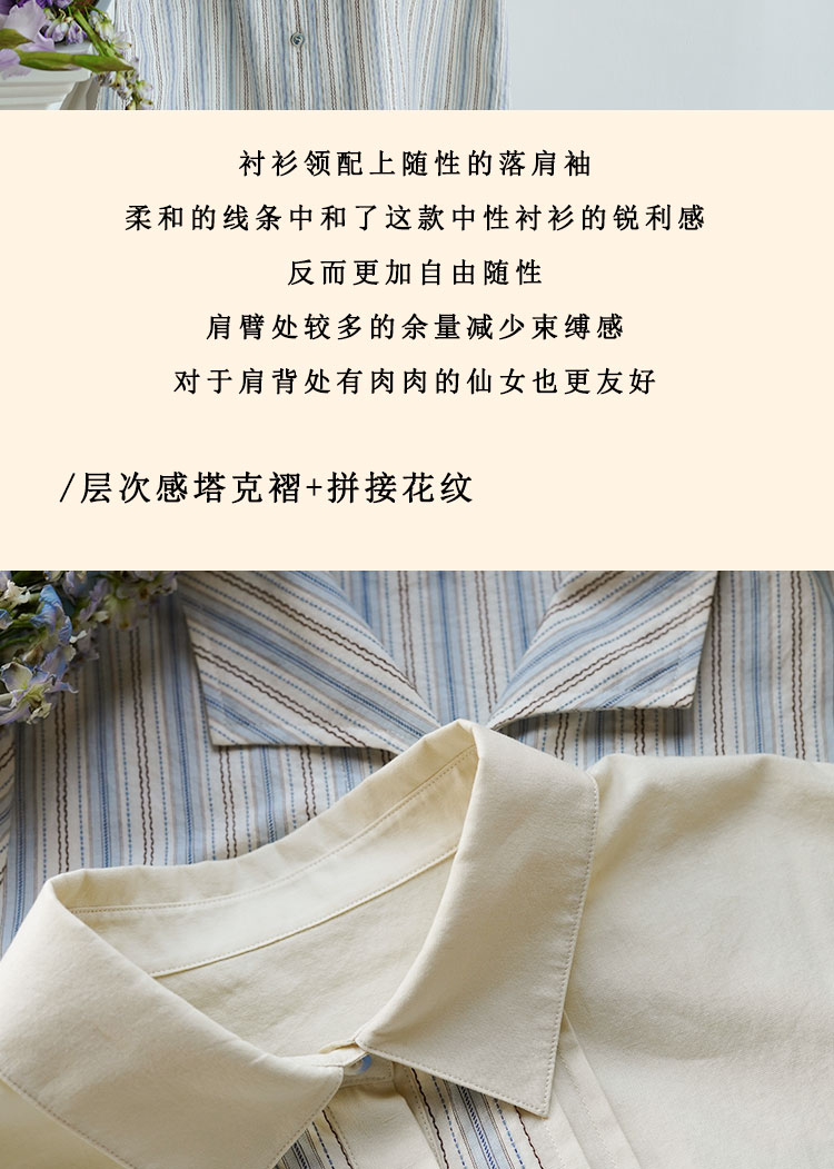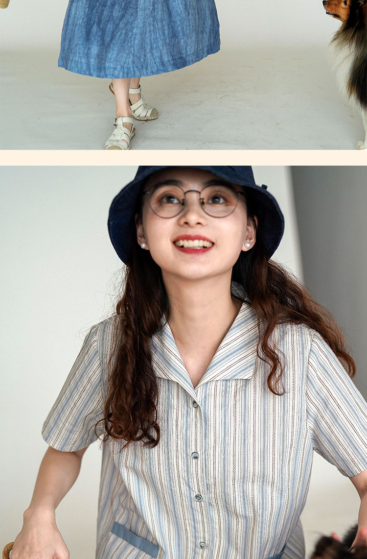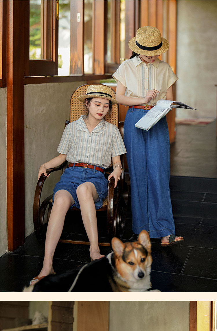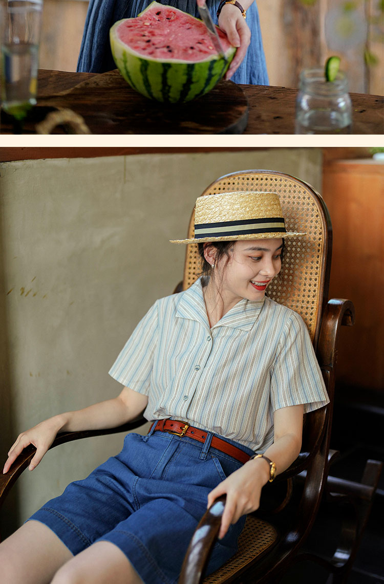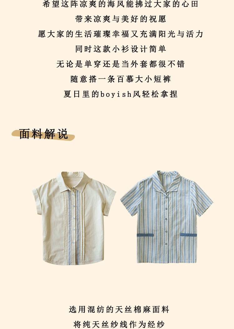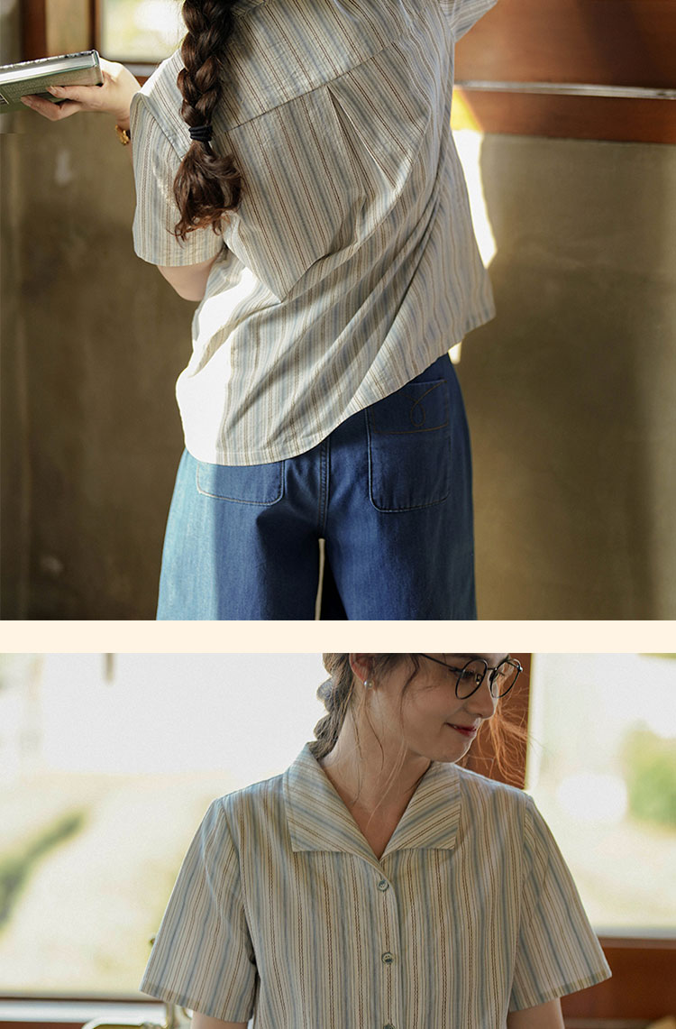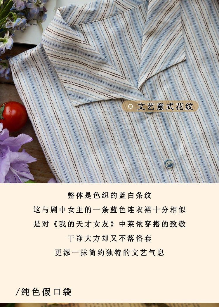 浮生八记/22B052/22B041/天丝棉麻拼接条纹刺绣短袖衬衫
