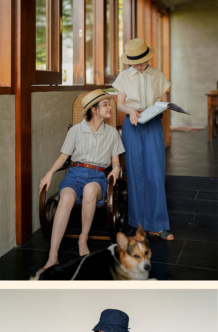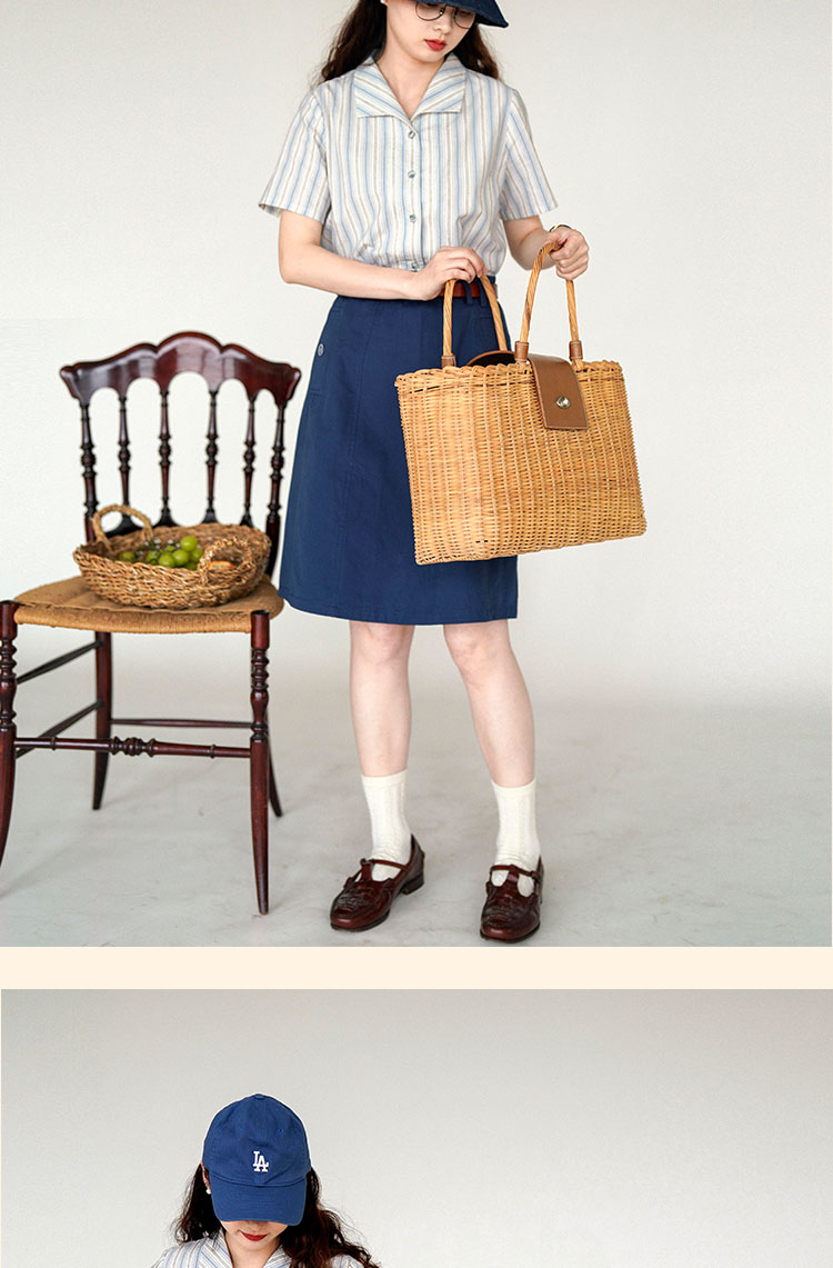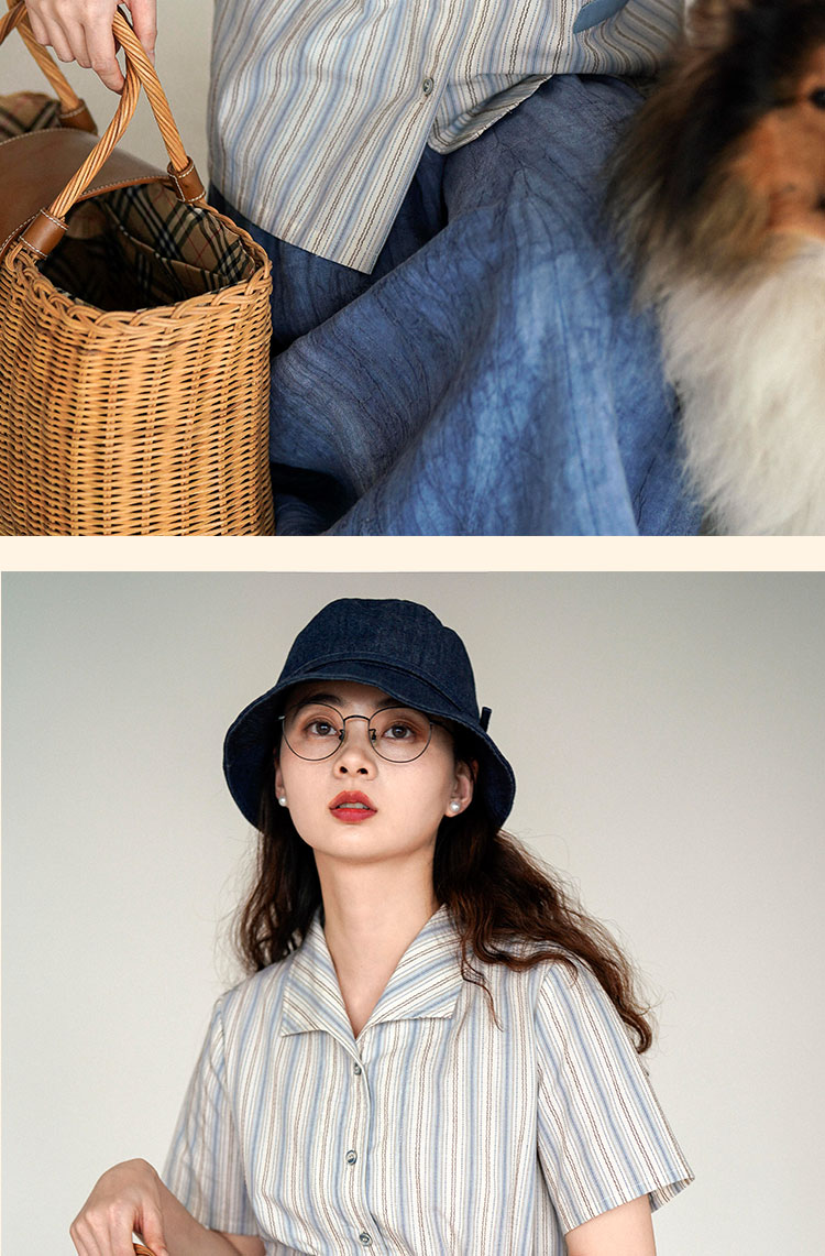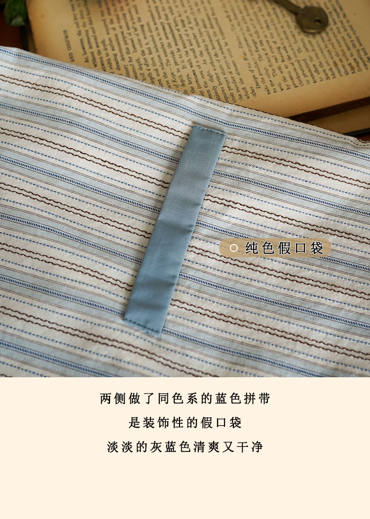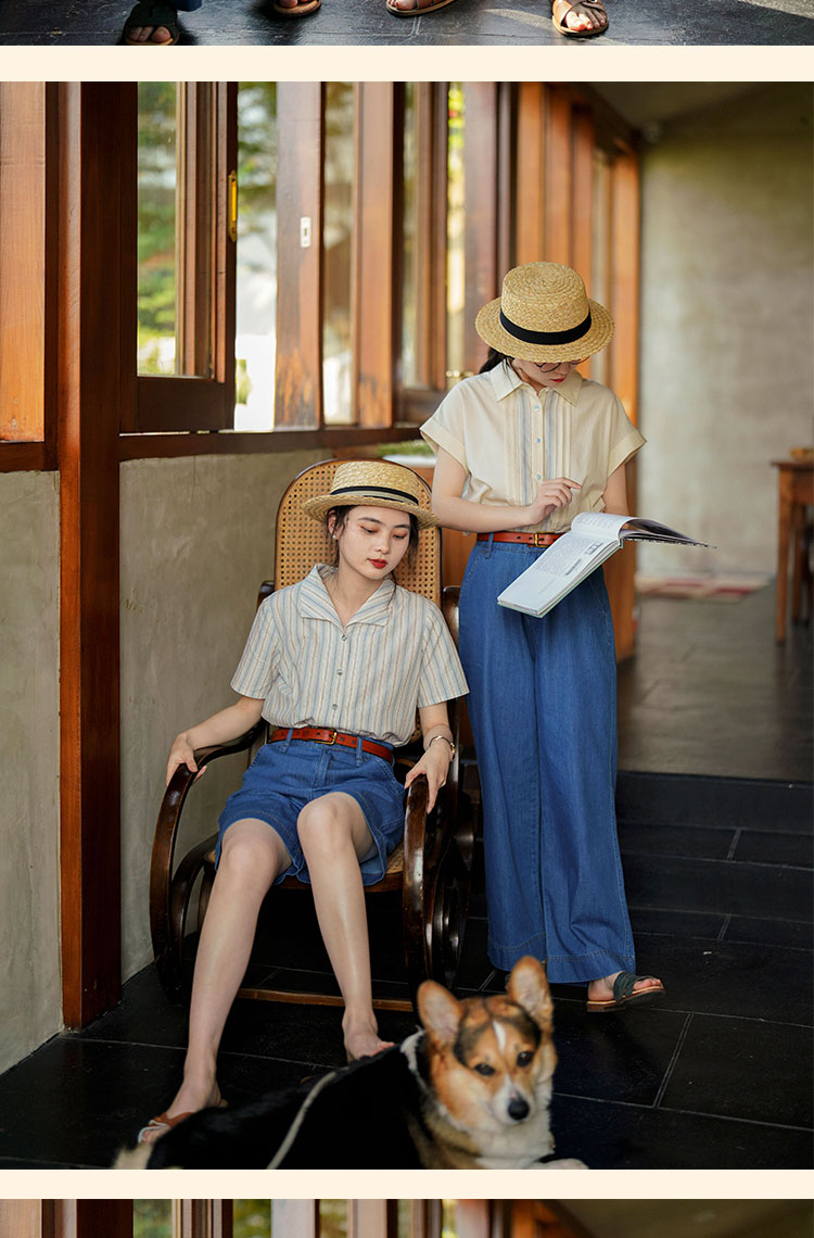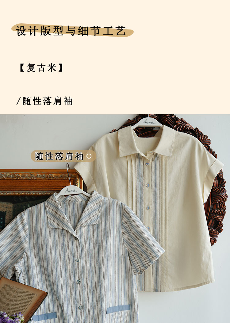 浮生八记/22B052/22B041/天丝棉麻拼接条纹刺绣短袖衬衫