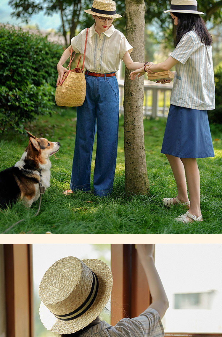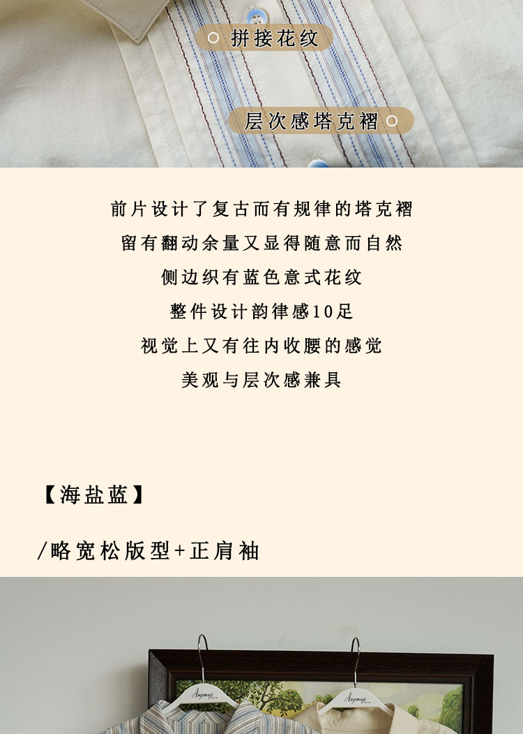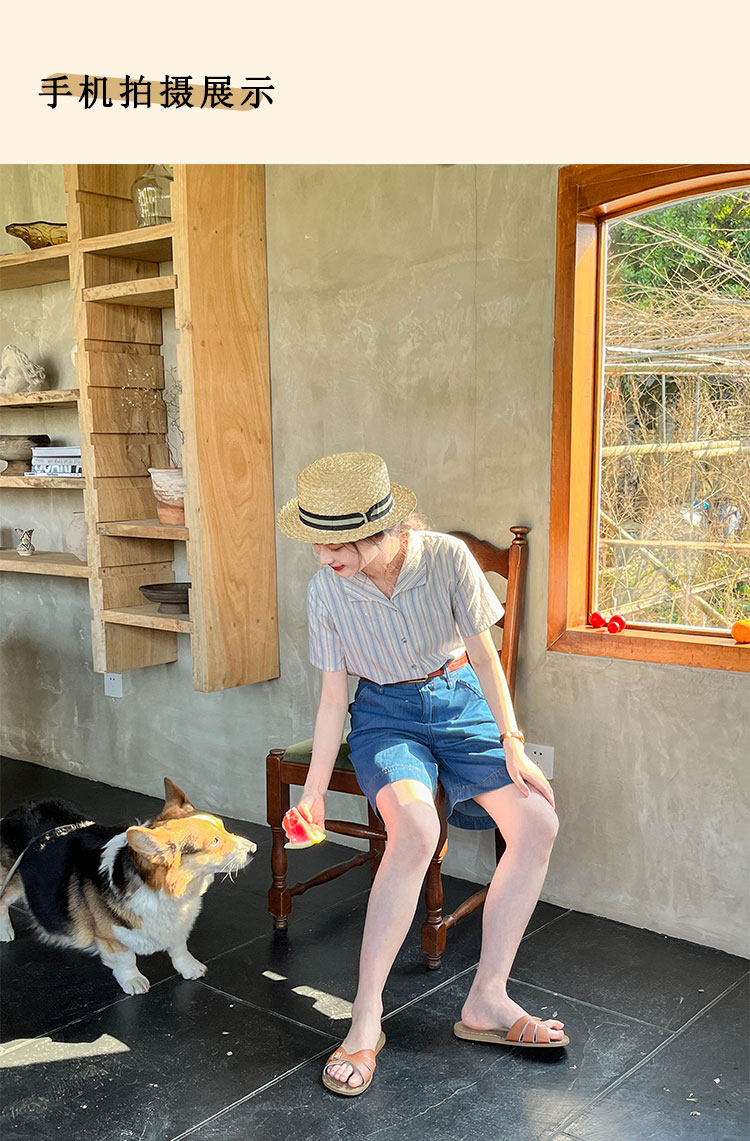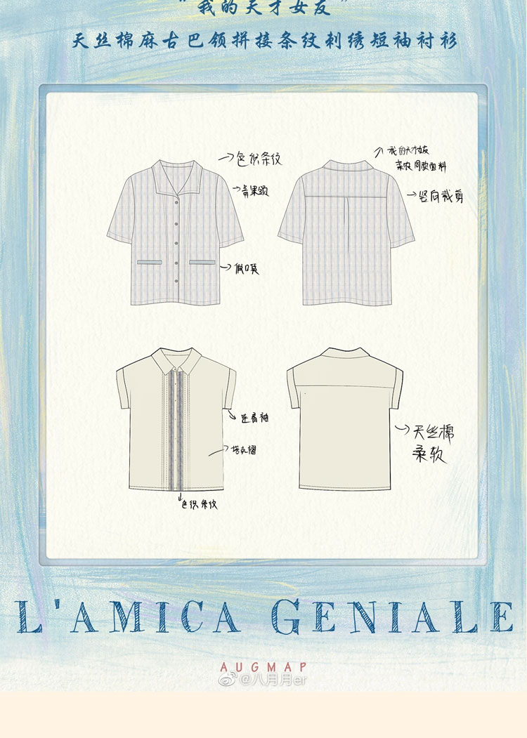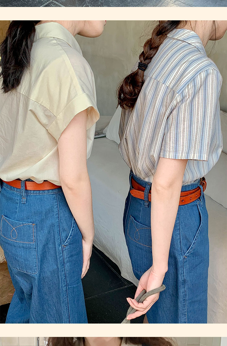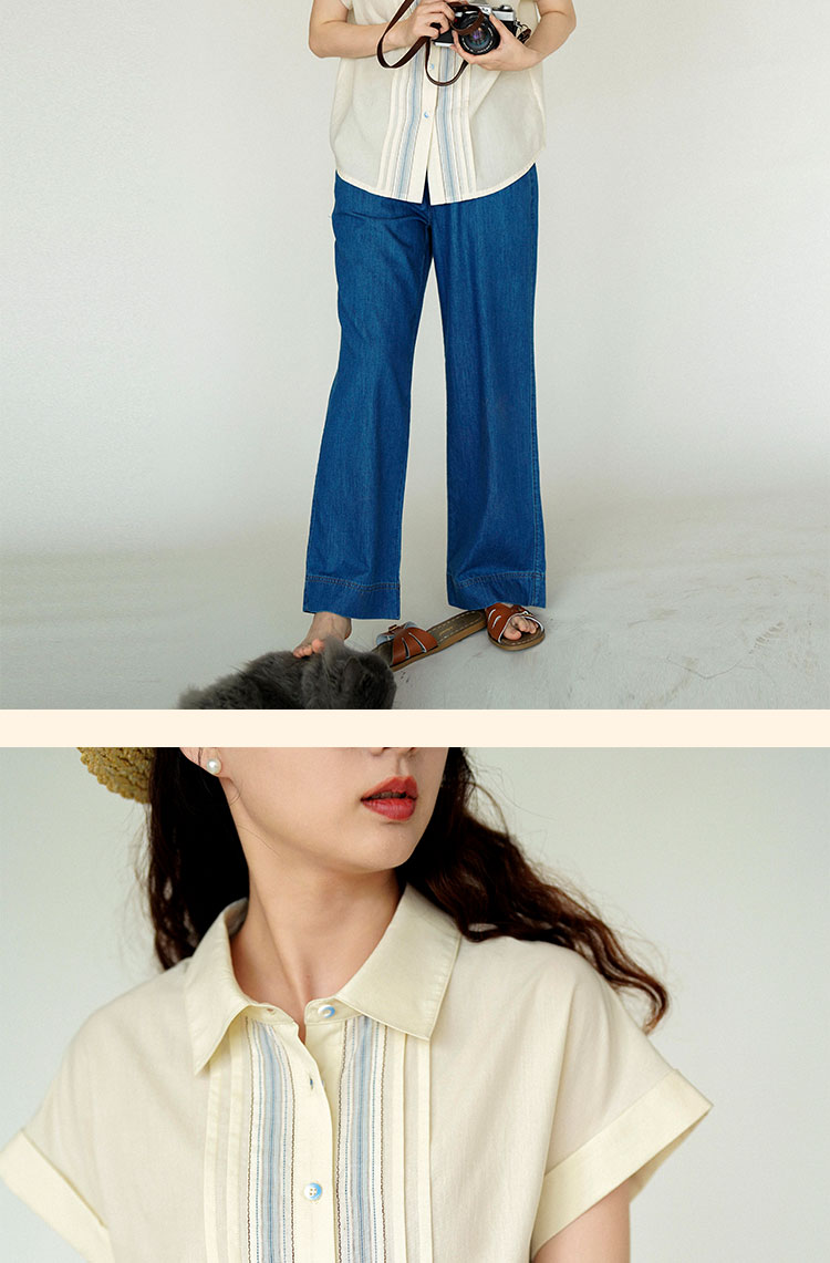 浮生八记/22B052/22B041/天丝棉麻拼接条纹刺绣短袖衬衫