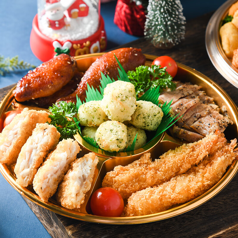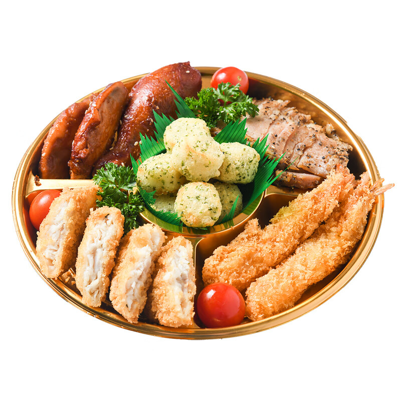 炸烤拼盘/份(内含:烤鸡翅2个烤鸡腿1个,美式烤肉40g白身鱼排2个虾棒2个,鳕鱼球8个)