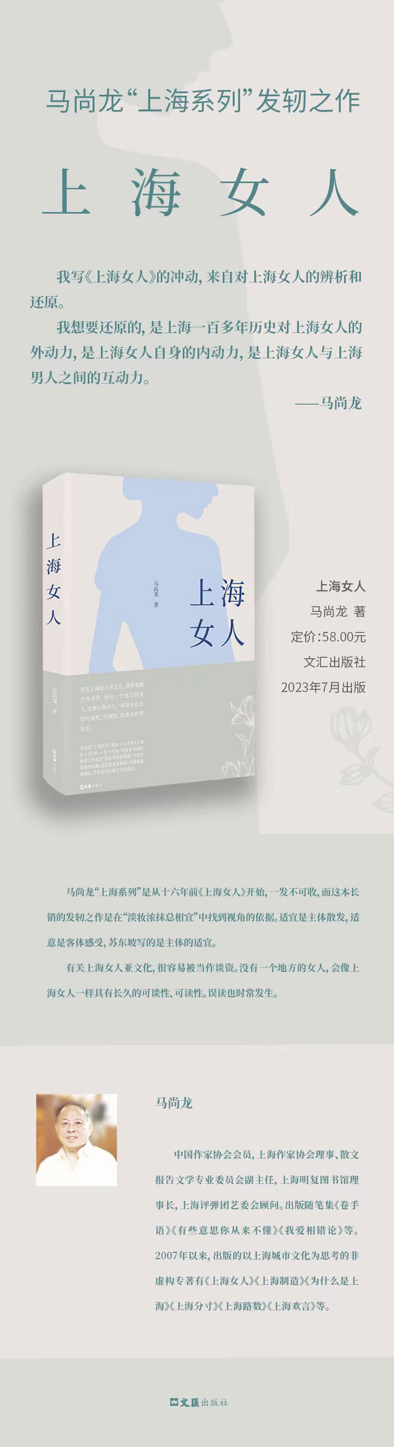马尚龙 中国作家协会会员,上海作家协会理事、散文报告文学专业委员会副主任,上海明复图书馆理事长,上海评弹团艺委会顾问。出版随笔集《卷手语》《有些意思你从来不懂》《我爱相错论》等。2007年以来,出版的以上海城市文化为思考的非虚构专著有《上海女人》《上海制造》《为什么是上海》《上海分寸》《上海路数》《上海欢言》等。