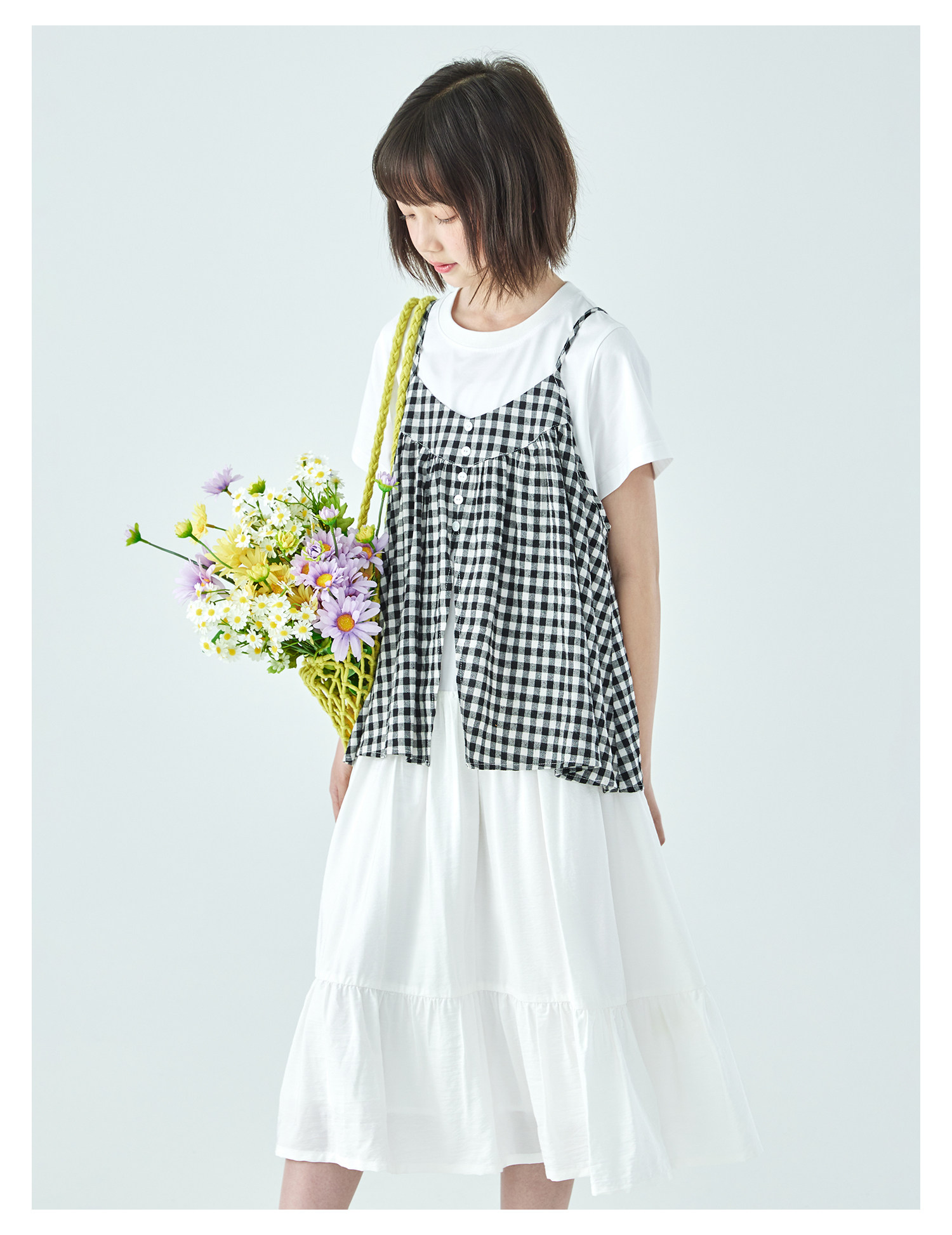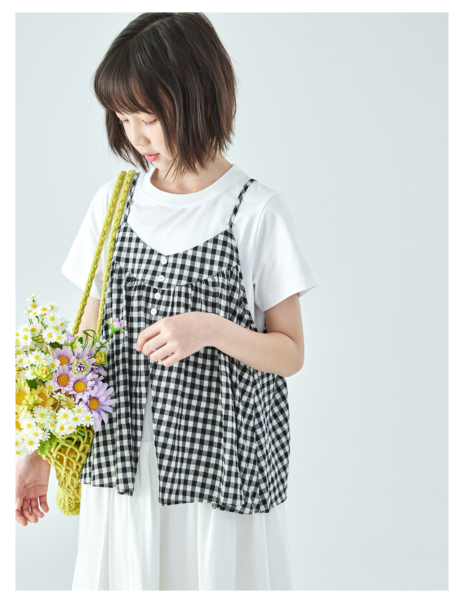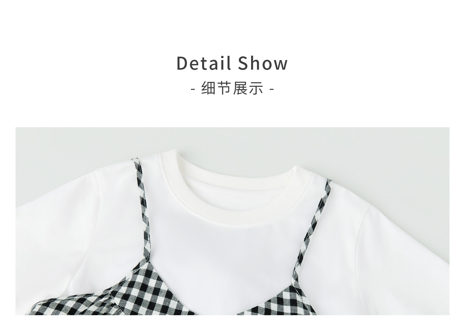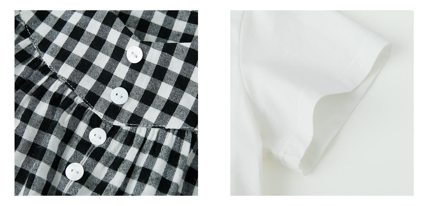 棵初26年夏新款亲子中大女童黑白格纹吊带短袖T恤连衣裙两件套装